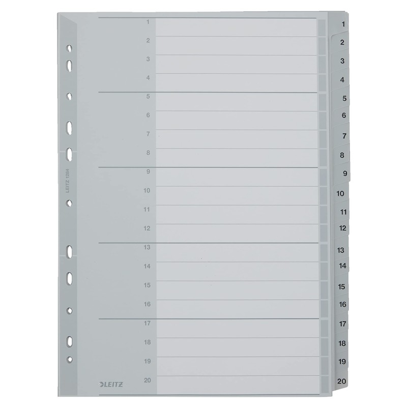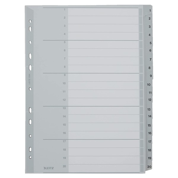 Aus Polypropylen (PP). Geprägte Tabe. Beschriftbares Deckblatt aus Karton. Auch für Ringbücher geeignet. Farbe: grau., Hersteller: Esselte Leitz, Marke: Leitz, Tabe: 1 - 20, Register mit: 20 Blatt
