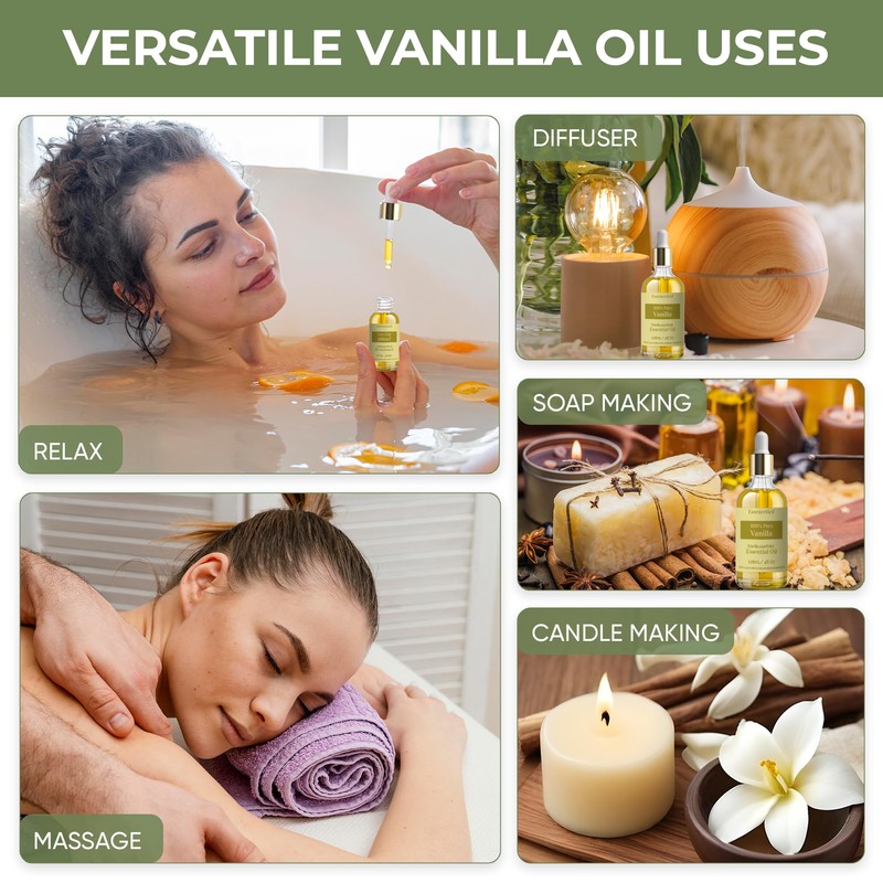 - CREATE A CALMING ATMOSPHERE — Use in your diffuser or apply topically to fill your space with a warm, inviting vanilla scent. Our vanilla essential oil for diffuser helps promotes relaxation, making it perfect for unwinding after a long day