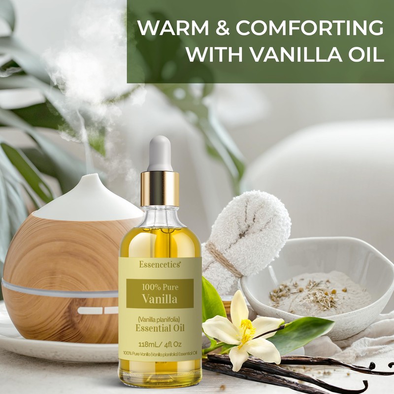 Essencetics Vanilla Essential Oil Blend - 4oz Glass Bottle with Dropper & Roll-On - 100% Pure & Organic - Infused with Natural Olive & Sunflower Oils - Perfect for Skin, Diffuser, Candle & Soap Making