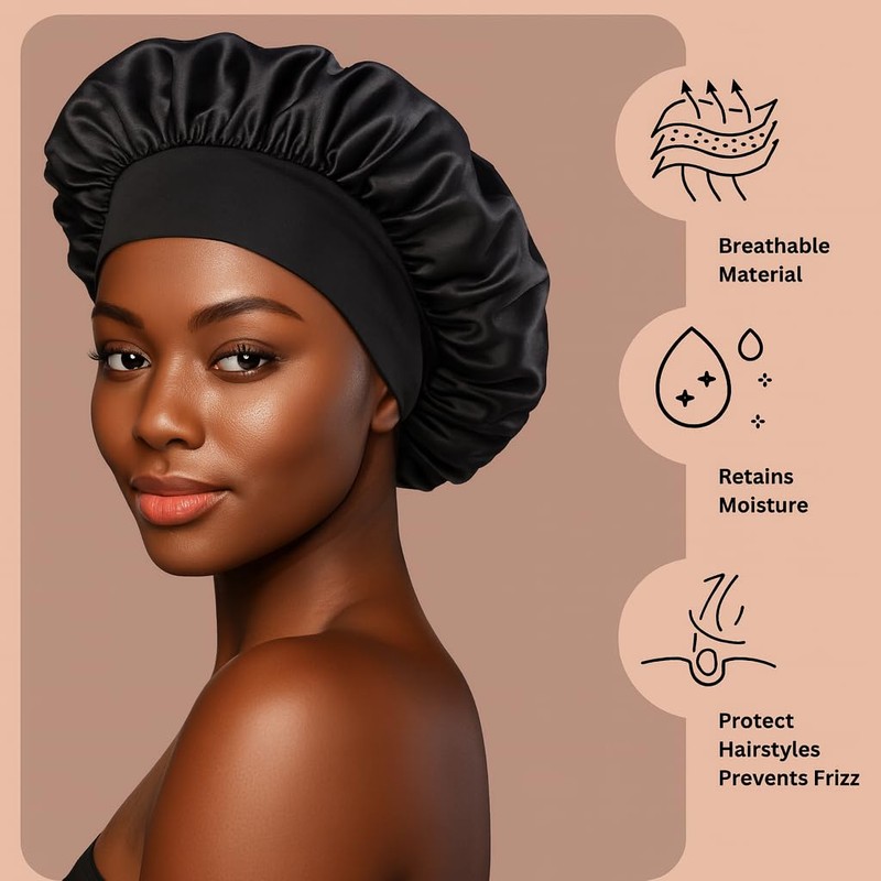 • 💤 Reduces Frizz & Breakage Overnight No more waking up to frizzy or tangled hair thanks to this satin bonnet. 😴 Its smooth fabric prevents friction that can cause split ends, dryness, and hair damage. Protective coverage ensures your style lasts longer between washes and touch-ups. Start each day with hair that’s polished and easier to manage.