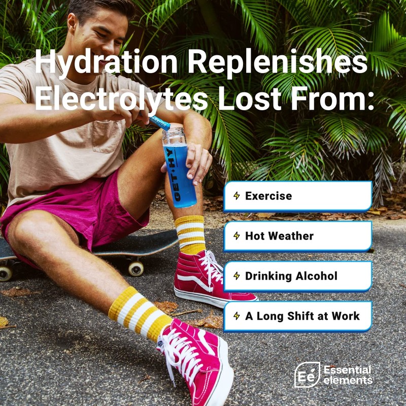 - Hydration Beyond a Glass of Water: When you sweat, you lose electrolytes. In fact, we lose electrolytes constantly, even when sitting!* Without enough water, muscles can cramp and really hinder your performance overall. In order for your body to absorb water, it requires electrolytes, which is why drinking them together helps you hydrate faster.* And it’s why Essential elements Hydration is the perfect go-to when you need to hydrate.*