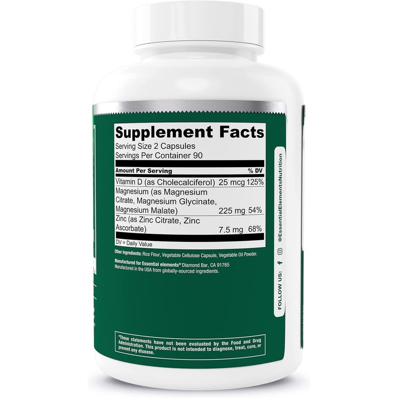 Essential Elements Magnesium & Zinc with Vitamin D3 for Sleep Immune & Bone Support - Magnesium Glycinate, Malate, Citrate 200mg - Triple Magnesium Supplement for Women and Men - 3 Month Supply