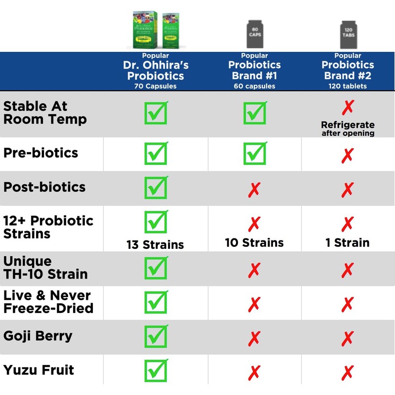 Dr Ohhira's Probiotics Capsules: Backed by 30+ years of research No refrigeration required.Because these live cultures are grown at room temperatures that change with the seasons, they are much hardier than your standard probiotics.??Enhanced with fermented super fruits:Plums, Goji berries, Figs, Blueberries, Red Bayberries, Yuzu Fruit??More strains = better results.Other brands may only contain 4 or fewer probiotic strains.These essential probiotics have 13 strains: Lactic acid bacteria Bifidobacteria (B. breve M-16V, B. infantis M-63, B. longum BB536), Enterococcus faecalis TH10, Lactobacilli (L. acidophilus La-14, L. brevis NBRC 3345, L. bulgaricus NBRC 13953, L. casei TO-A, L. fermentum NBRC 3071, L. helveticus NBRC 3809, L. plantarum TO-A), Streptococcus thermophilus NBRC 13957, and Bacillus coagulans SANK 70258.??Not freeze dried.Other probiotic brands may mix strains after they have been freeze-dried, so it's not clear how they will behave once ingested. Dr. Ohhira's Probiotics are grown together.Dr Ohhira?s Probiotics has 13 strains for effective results??Enriched with Nutrient-Rich PostbioticsProbiotics break down food into vitamins, chelated minerals, amino acids, and short-chain fatty acids (aka postbiotics) Dr.Ohhira's includes the postbiotic vitamins, amino acids, and chelated minerals created over 3 years. Order Doctor Ohhira's probiotics today. (Also available in a professional formula.)