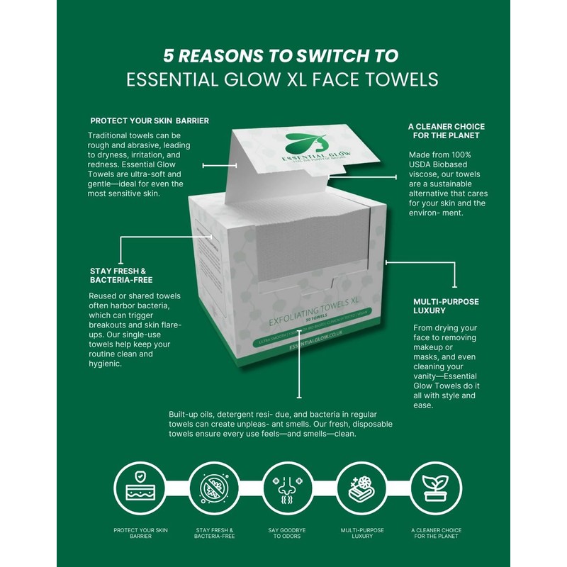 Essential Glow Exfoliating Face Towels, Ultra Smooth Disposable Towelettes, 100% Biobased, Clinically Tested, Makeup Remover Dry Wipes, 50 Towels, 1 Pack