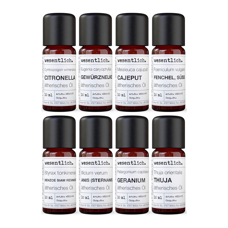 - 100% natural - set of 8 essential oils from wesentlich. - Fine oils from a German manufacturer? Bottling, shipping and control in Germany. With any oil from wesentlich. All information is available - if you have any questions, please contact us!