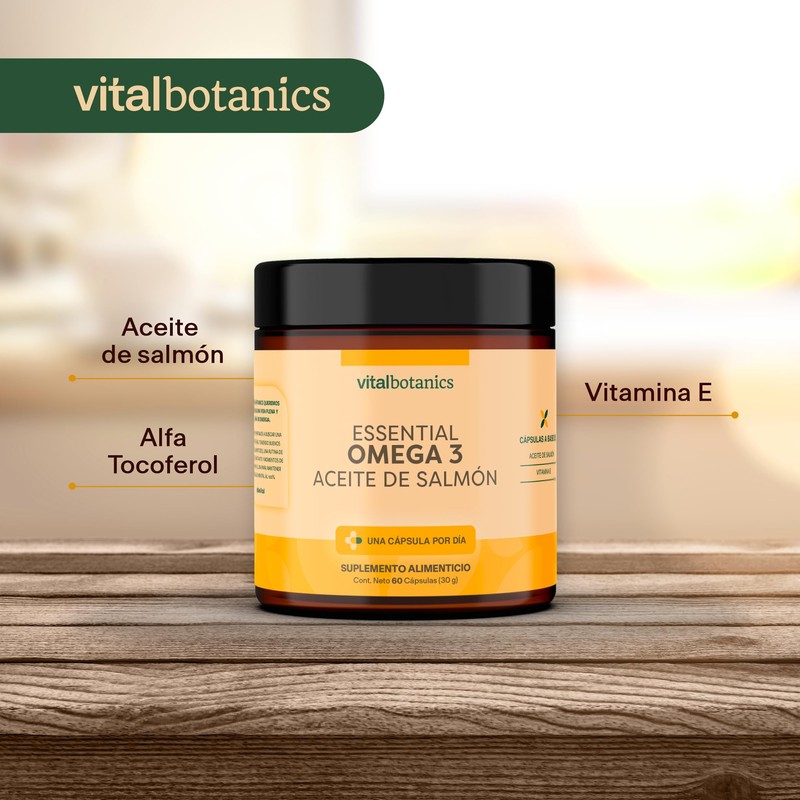 Essential OMEGA 3 Aceite Puro de Salmón con Vitamina E de 60 Cápsulas (2 meses) VitalBotanics. Suplemento para Hombre y Mujer a base de Aceite de Pescado. Suplemento Multivitaminico. El envase puede variar