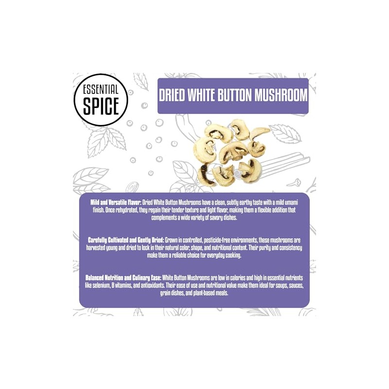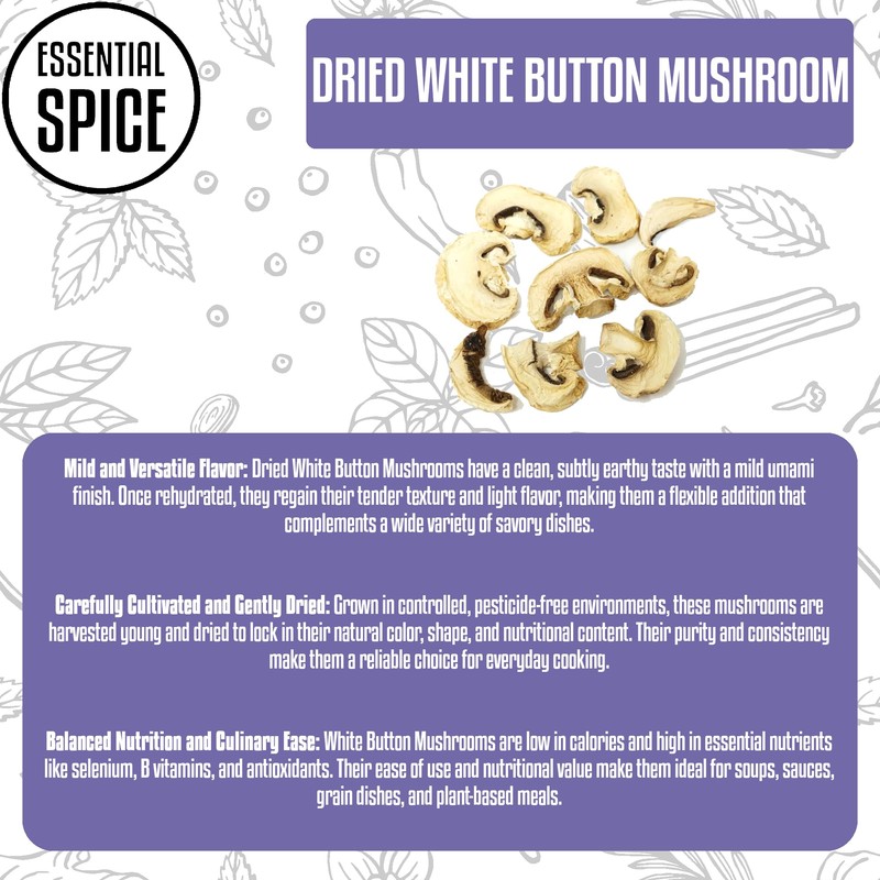 Essential Spice Dried Sliced White Button Mushrooms – Premium Quality, Mild & Savory Flavor – Ideal for Soups, Sauces, Stir-Fries & Pasta – Easy to Rehydrate, Great Pantry Staple (1 lb)