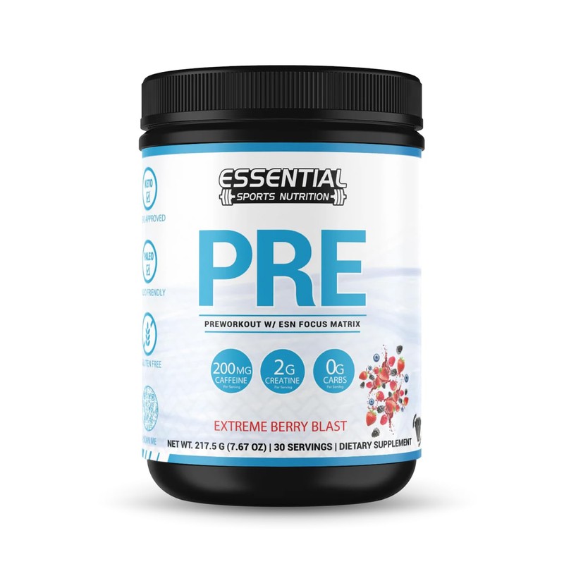 Essential Sports Nutrition PRE | Pre-Workout with Creatine, Focus Formula, and 200mg Caffeine (n/a, Extreme Berry Blast)