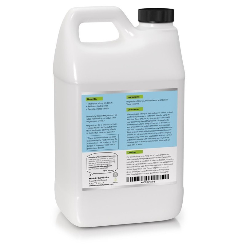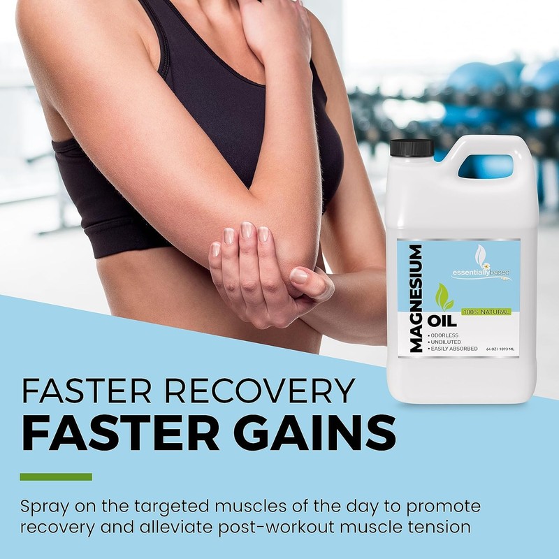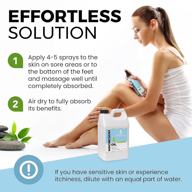 The essentiallybased Magnesium Spray, is a natural solution to support overall wellness and vitality. Sourced from pure magnesium chloride, this topical spray offers a convenient way to replenish magnesium levels in the body. Magnesium plays a crucial role in numerous bodily functions, including muscle relaxation, promoting better sleep, and supporting energy production. Our Magnesium Oil Spray is carefully formulated for optimal absorption, allowing magnesium to penetrate deeply into the skin for maximum benefit. Simply spray onto the skin and massage gently for quick and effective absorption. Experience the rejuvenating effects of magnesium with our Magnesium Oil Spray. Whether you're looking to soothe sore muscles after a workout or support overall health and vitality, our magnesium oil spray for muscle pain is the perfect addition to your daily wellness routine. Our Magnesium oil spray for sleep, formulated with pure magnesium chloride, promotes relaxation and supports natural sleep patterns. Its effects aid in achieving a peaceful slumber when applied before bedtime. Say goodbye to restless nights and wake up refreshed with our natural sleep aid.