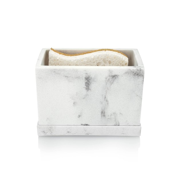 - Keep your kitchen sink area tidy with our modern white marble sponge holder. This sink caddy holds two regular size sponges and includes a drain tray.
