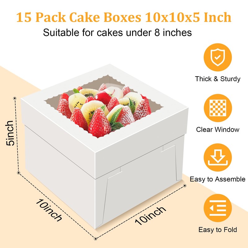 Essenya 15 PCS Cake Boxes 10 Inch, 10x10x5 Inch Cake Box, 10 Inch Cake Box with Window, White Bakery Boxes, Large Baking Boxes, Cajas Para Pasteles, 10x10 Cake Boxes for Birthday, Wedding, Party, Business