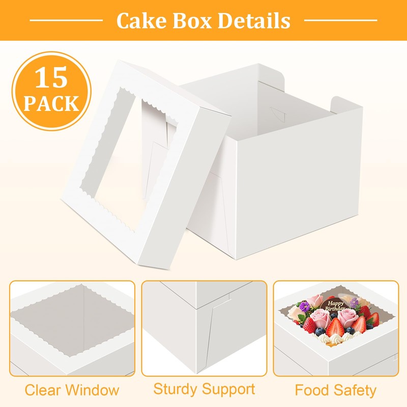 - 15 Value Pack Cake Boxes with 80 Stickers: 15 pack cake boxes 10 inch can easily meet your use and replacement needs in daily life. 80 DIY exquisite stickers make every occasion special. Whether for home use or business use, our classic and versatile white cake box is perfect for your beautiful cakes.