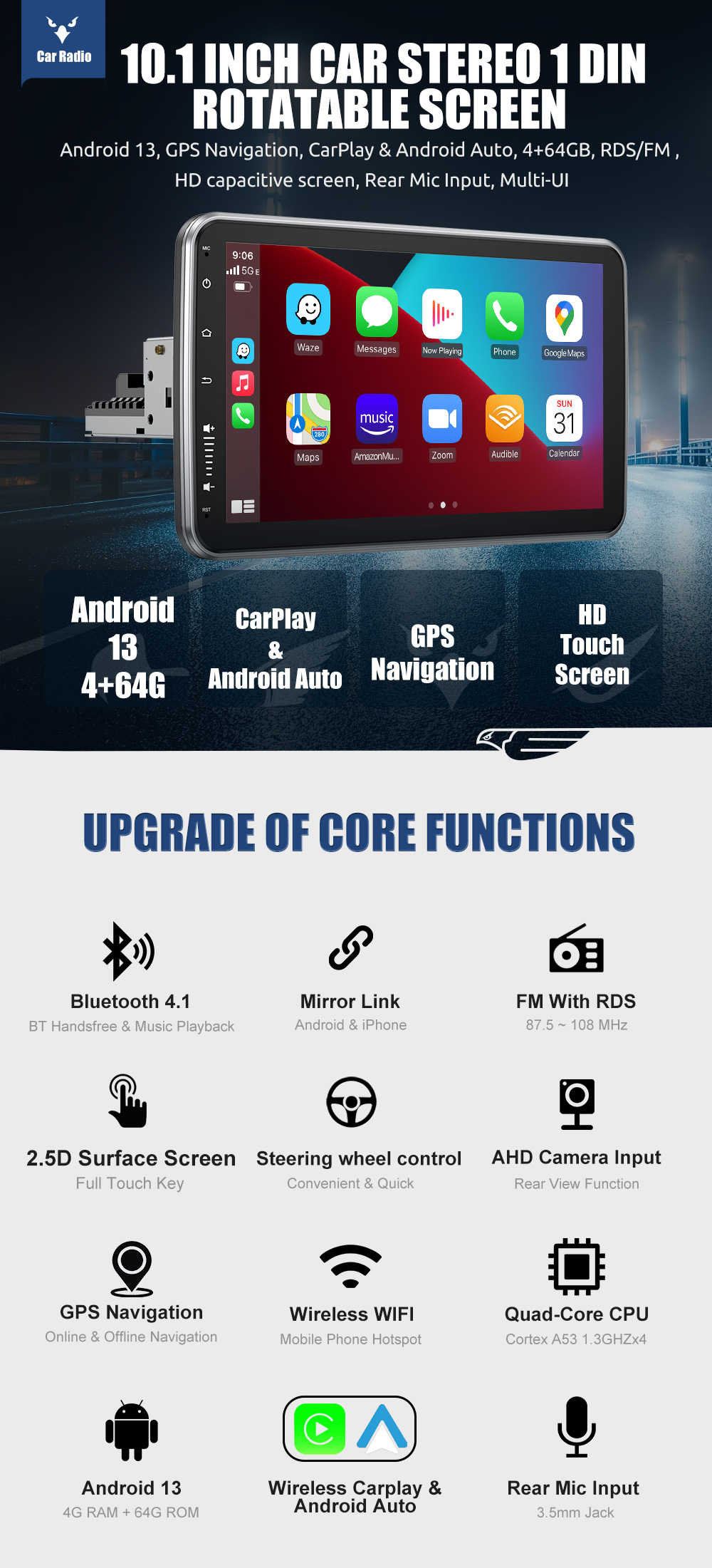 - Features: Android, Animated Display, Apple Carplay, ASP, Bluetooth, Built-in Equalizer, Built-in GPS Antenna, FM Radio, GPS, Hands-free Kit, HD Radio Ready, ID3tag, Internal GPS Antenna, Mirror Link, RDS, Rotatable Screen, Sat Nav Compatible, Steering Wheel Control, Touchscreen, USB, WIFI, WMA, Android Auto