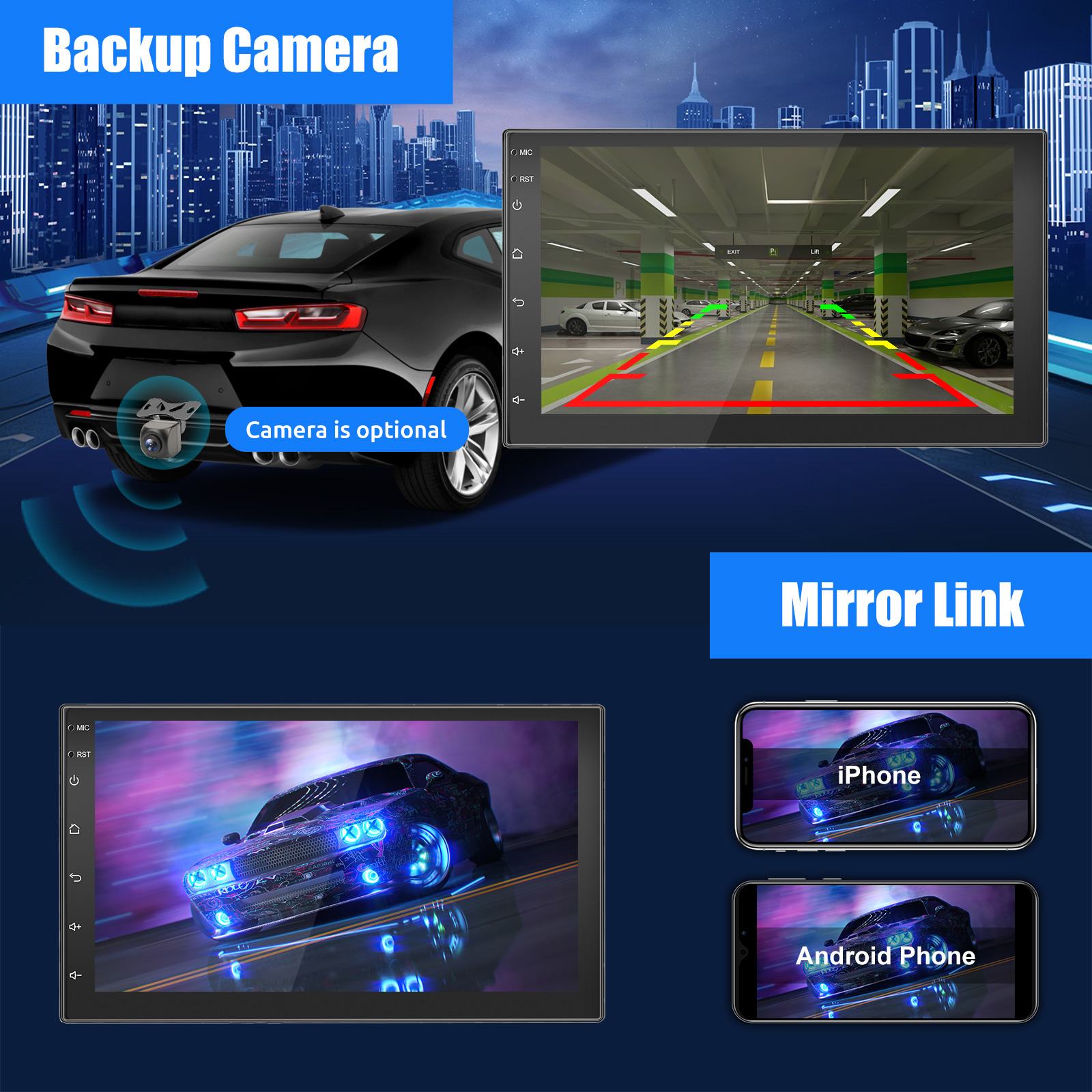 7 Inch 2 DIN Android Car Radio: The Android car radio with 7 inch capacitive touch screen, 4GB RAM and 64GB ROM provides enough space to download your favourite apps and videos, so driving won't be boring anymore. With two USB ports, it supports fast mobile phone charging. With the rear microphone input, you can add a microphone to make your voice clearer (not included).