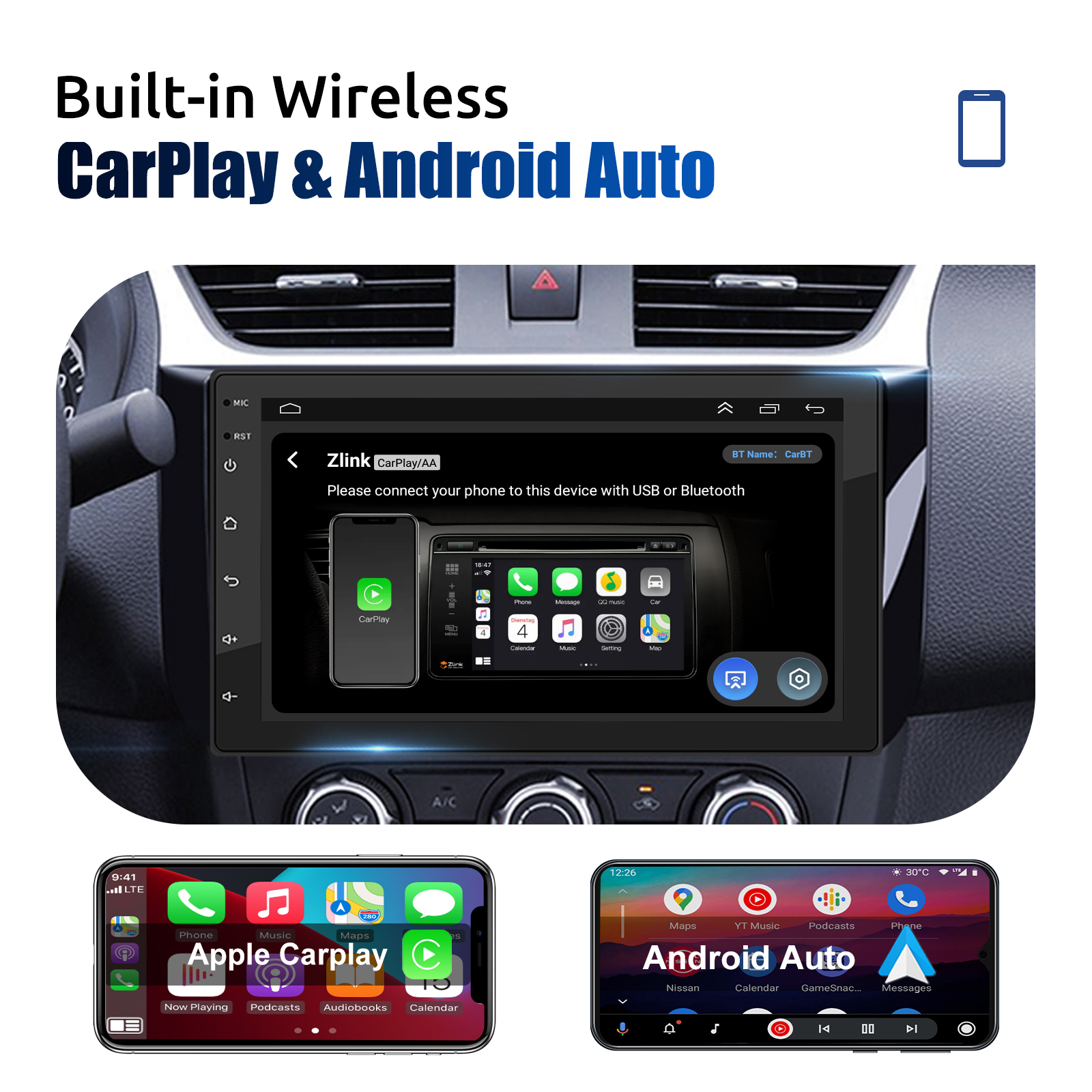 Mirror Link & Wireless Carplay & Android Auto: With this car radio, you will experience the impressive Mirror Link function, compatible with iOS and Android phones. You can mirror your smartphone screen to the car radio using apps like Google Maps, Spotify, Youtube, etc. Replace your mobile phone with the car screen and turn your vehicle into a smart platform. Immerse yourself in a seamless and user-friendly infotainment experience with Apple CarPlay & Android Auto. Connect your iPhone to Apple CarPlay or your Android smartphone to Android Auto and securely access calls, texts, navigation, music and more. With intuitive operation via the touchscreen or voice control, you have all functions at your fingertips while you remain safely at the wheel. Use your favorite apps and stay connected at all times while keeping your eyes on the road. Turn your vehicle into an extended hub for your mobile devices and experience a new dimension in infotainment.