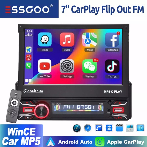ESSGOO 7" Car Stereo 1 DIN Radio Flip Out Touch Screen BT 2USB AUX Type-C Single