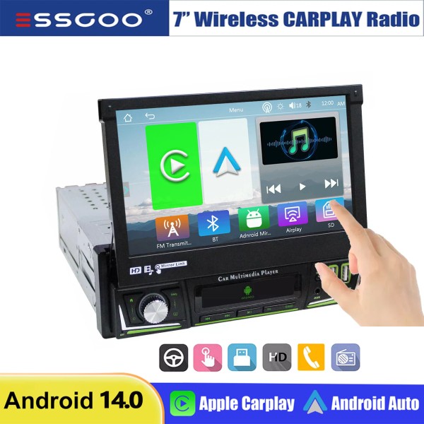 ESSGOO 7" Single 1 DIN Android 14 4+64G Flip Out Screen Bluetooth Car Stereo Radio GPS