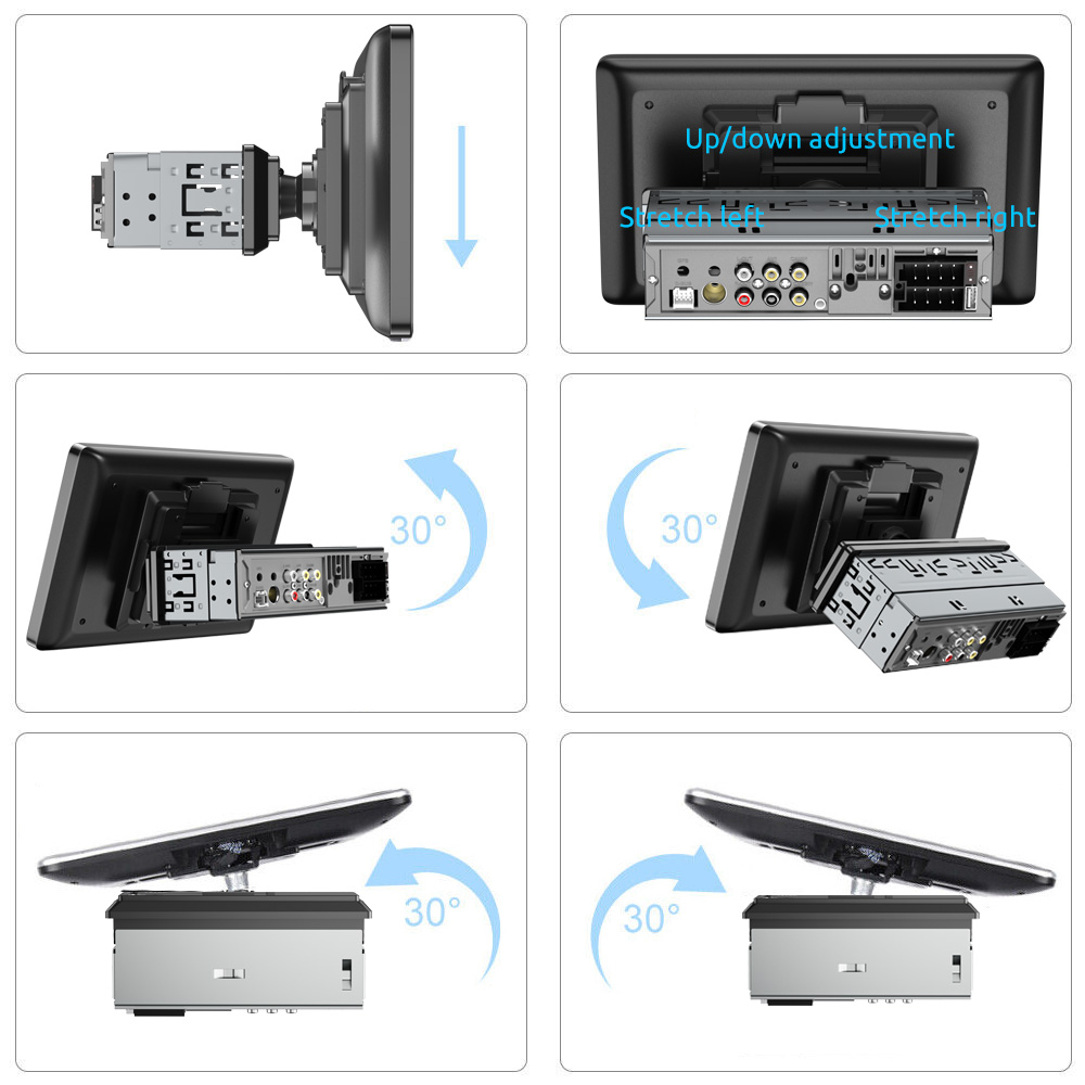 【9-Inch Single 1 DIN Touchscreen Car Radio】9-inch 1120 x 480 HD IPS capacitive screen 2.5D designed. Universal 1 DIN standard installation size 7"×2" / 178*50MM to fit most vehicles. Our 1 din stereo is equipped with a 9-inch IPS 2.5 HD capacitive touch screen and it makes more sensitive and accurate. 3 ways to adjust screen to provide comfort viewing angle for driver and passager, up and down, forward and backward(30°), left and right(30°)