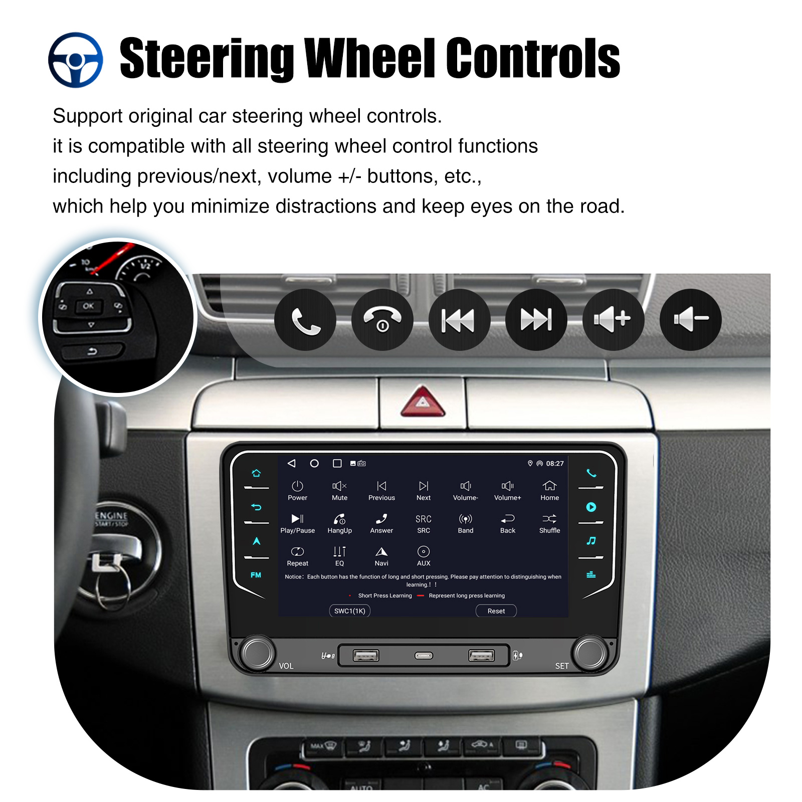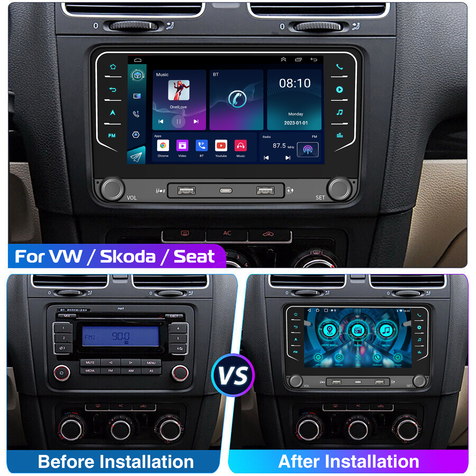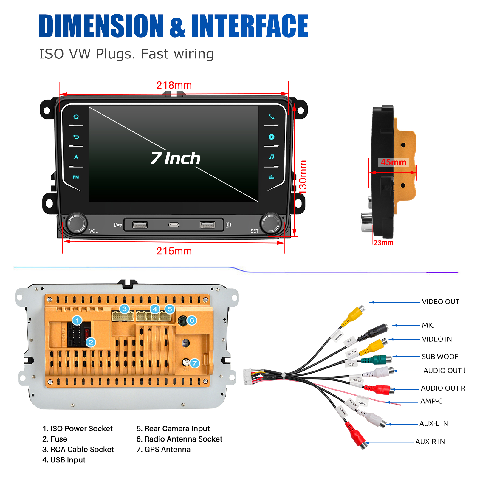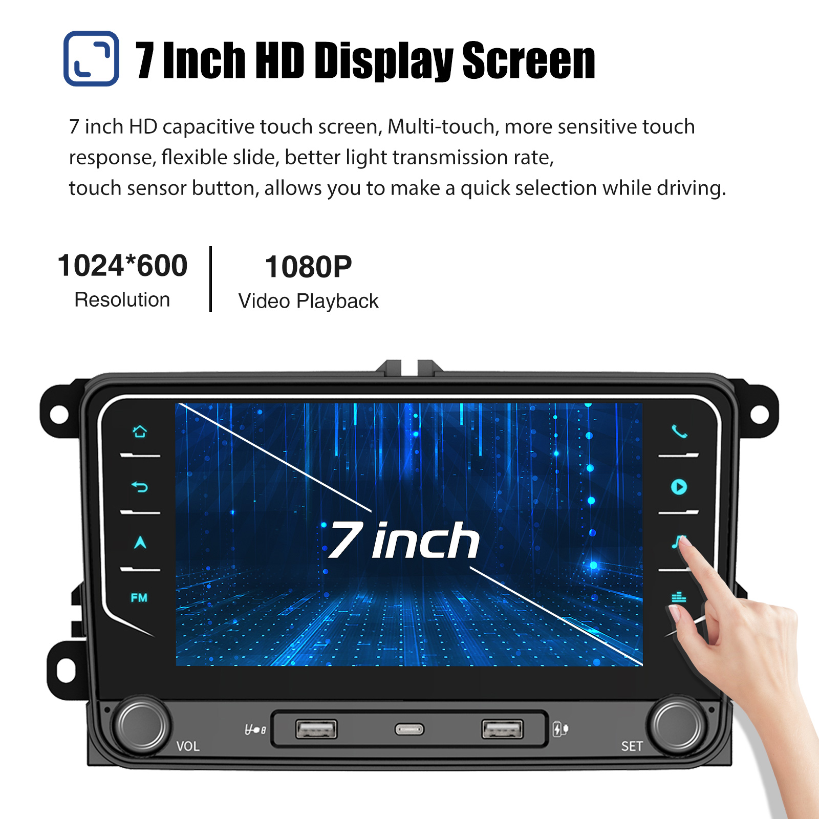 7 Inch Android 14 Car Radio VW/PASSAT/GOLF/SEAT/SKODA/POLO: The Android car radio with 7" 1024*600 HD capacitive touch screen, toush sensor key, 2GB RAM and 64GB ROM allows you to download your favorite apps and videos, so that driving will never be boring .No additional frame, no cable change, plug and play.