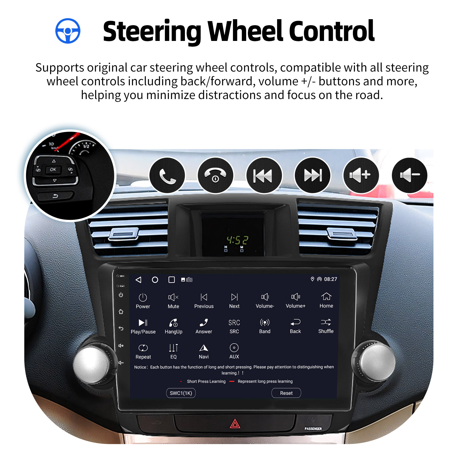 AHD Rear View Camera Input & Steering Wheel Control: After connecting to the rear view camera. The radio automatically displays the reversing image as soon as you engage reverse gear. Make your daily reversing safer. Support AHD camera. Support original car steering wheel control to make driving more convenient and safer.