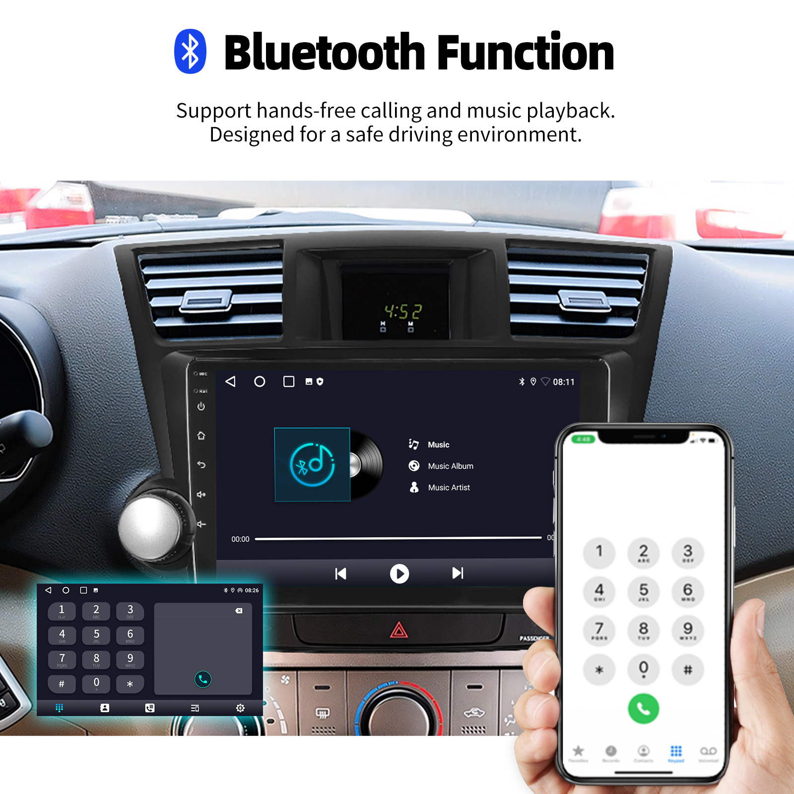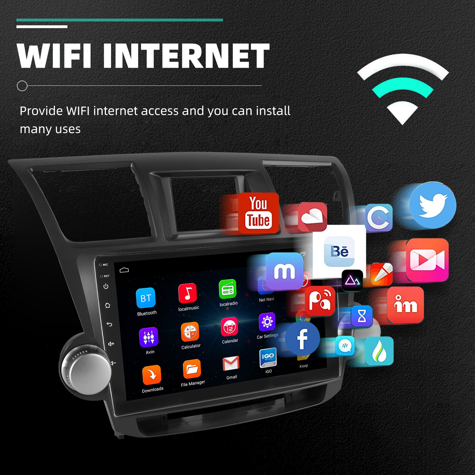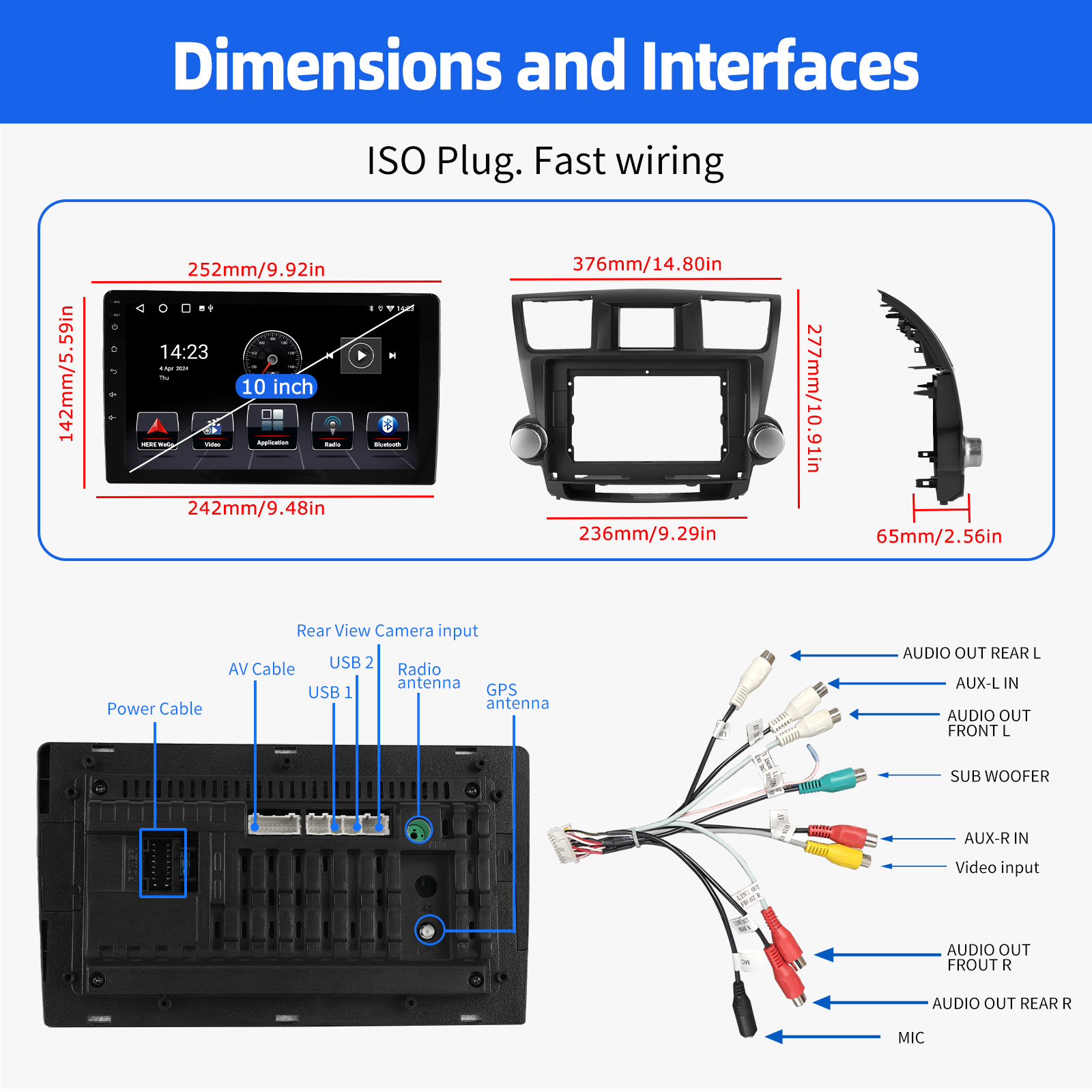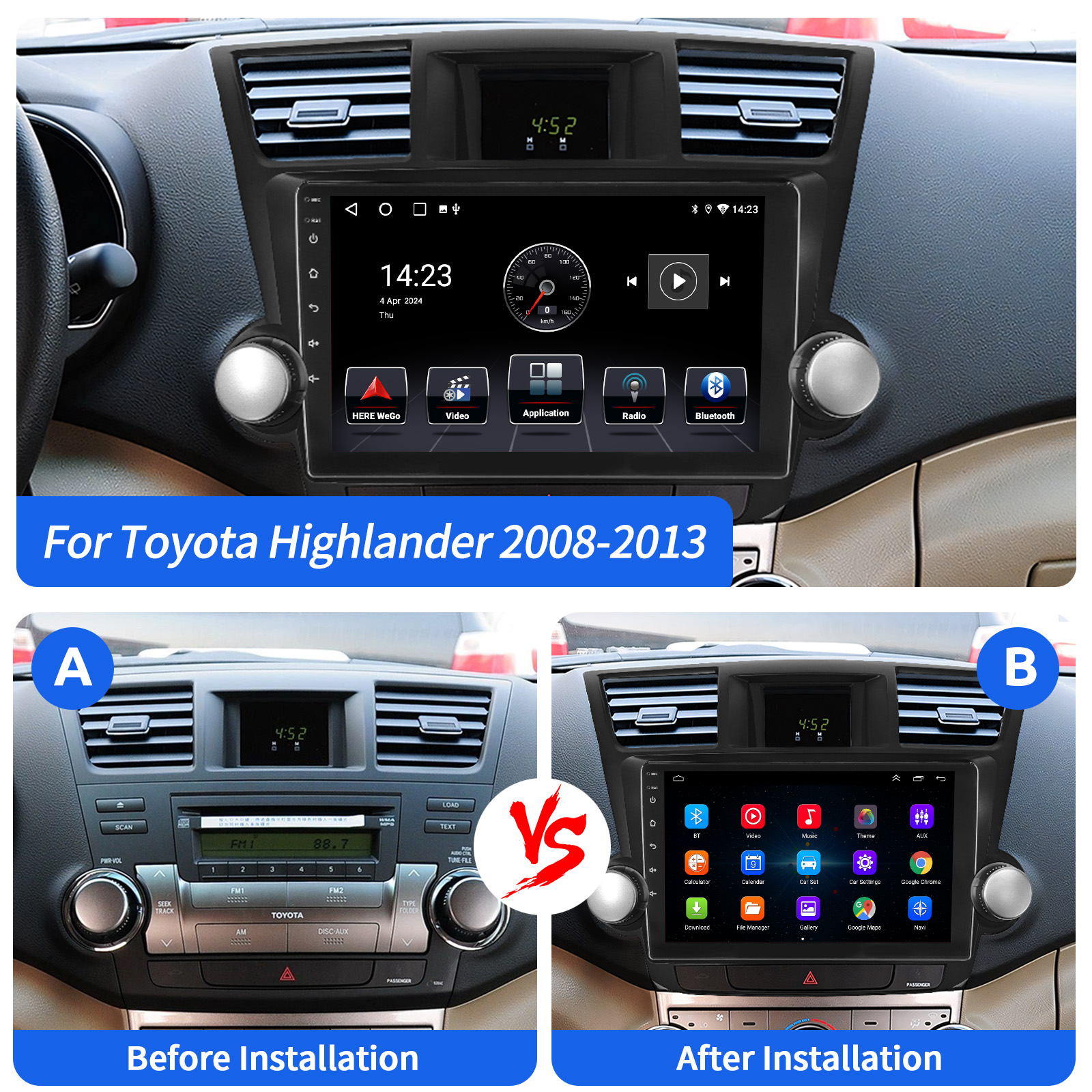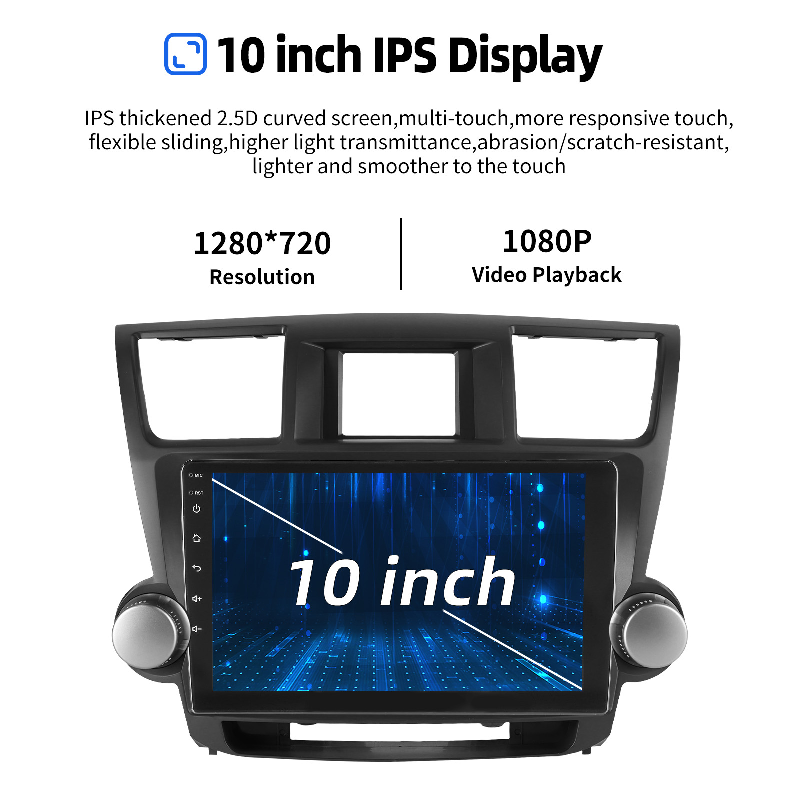 10 Inch Android 14 Car Radio For Toyota Highlander 2008-2013: The Android car radio with 10" 1280* 720 HD capacitive touchscreen, 4GB RAM and 64GB ROM allows you to download your favorite apps and videos, so driving is no longer boring. No extra frame, no cable change, plug and play.