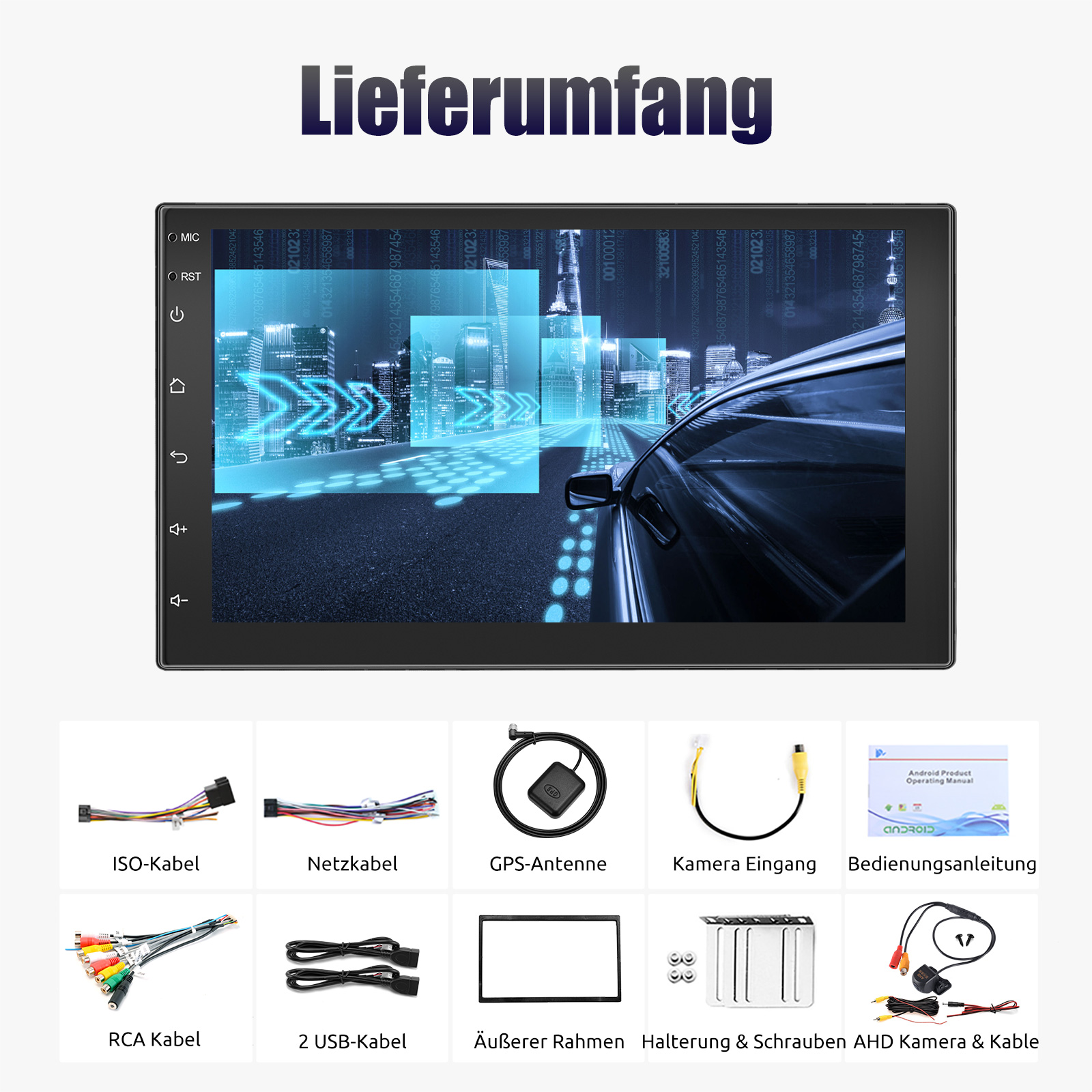 7 Inch 2 DIN Android Car Radio: The Android car radio with 7 inch capacitive touch screen, 2GB RAM and 32GB ROM provides enough space to download your favourite apps and videos, so driving won't be boring anymore. With two USB ports, it supports fast mobile phone charging. With the rear microphone input, you can add a microphone to make your voice clearer (not included).