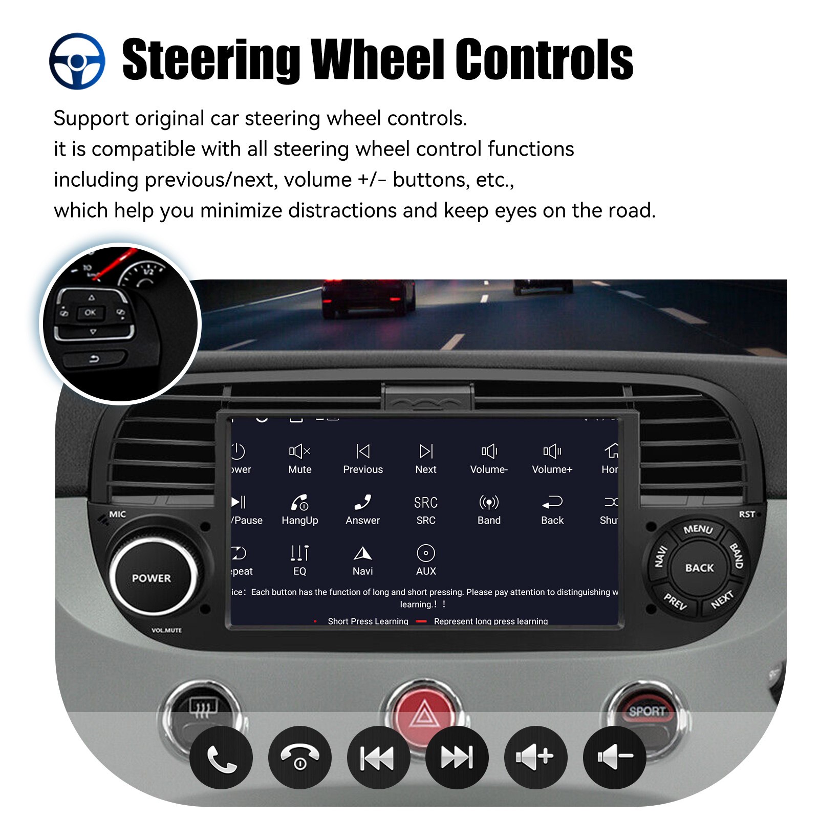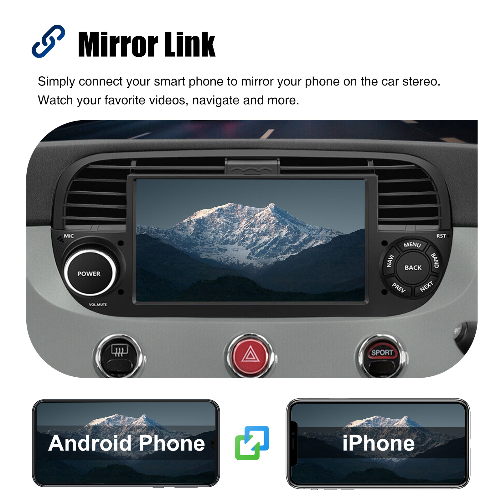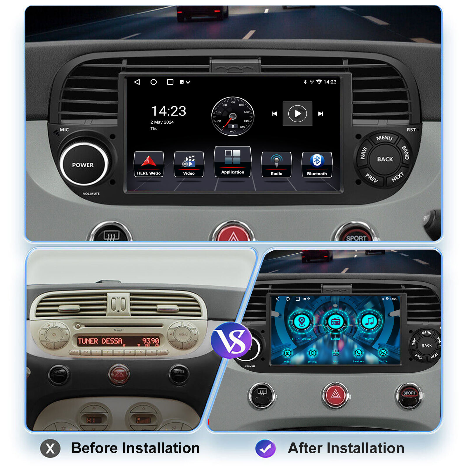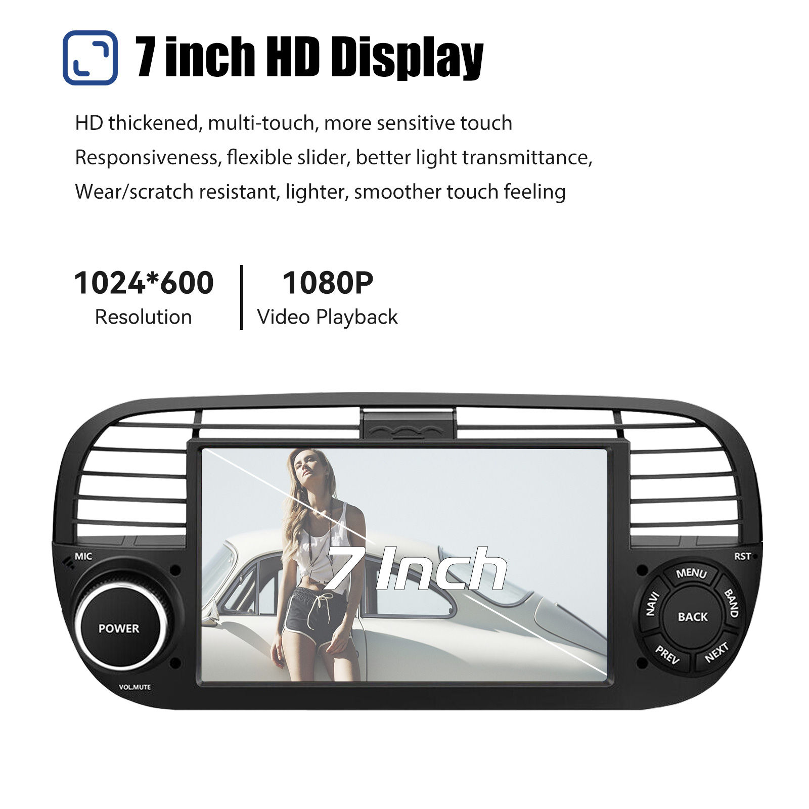 7 inch Android 14 car radio for FIAT 500 2007-2015:The Android car radio with 7" 1024*600 HD capacitive touch screen, 2GB RAM and 64GB ROM allows you to download your favorite apps and videos, so that driving is no longer boring. No additional frame, no cable change, plug and play. It comes with Canbus and supports most of the original functions: steering wheel control, reverse signals and reading original computer data, etc.Wireless Carplay & Android Auto: Immerse yourself in a seamless and user-friendly infotainment experience with Apple CarPlay & Android Auto. Connect your iPhone to Apple CarPlay or your Android smartphone to Android Auto and securely access calls, texts, navigation, music and more. With intuitive operation via the touchscreen or voice control, you have all functions at your fingertips while you remain safely at the wheel. Use your favorite apps and stay connected at all times while keeping your eyes on the road. Turn your vehicle into an extended hub for your mobile devices and experience a new dimension in infotainment.