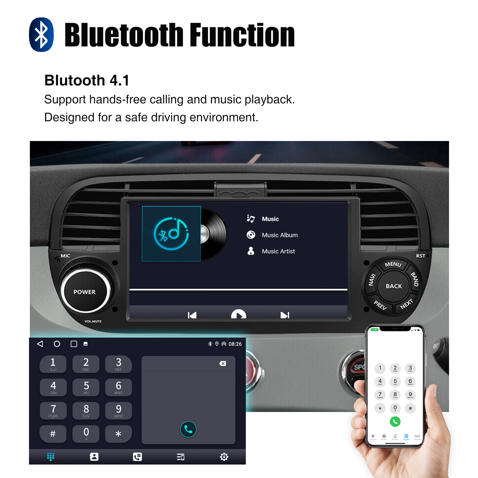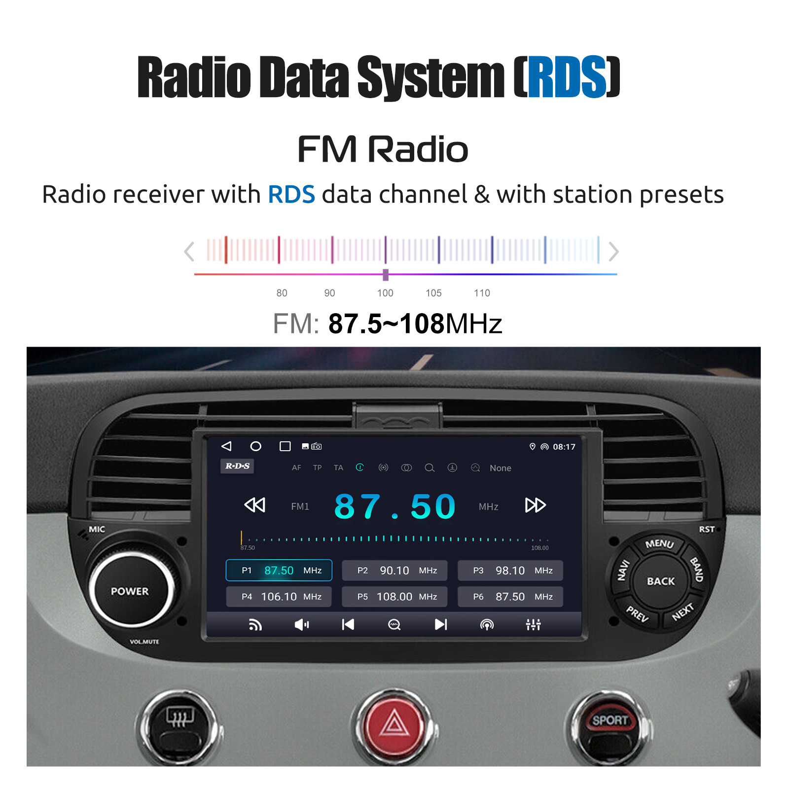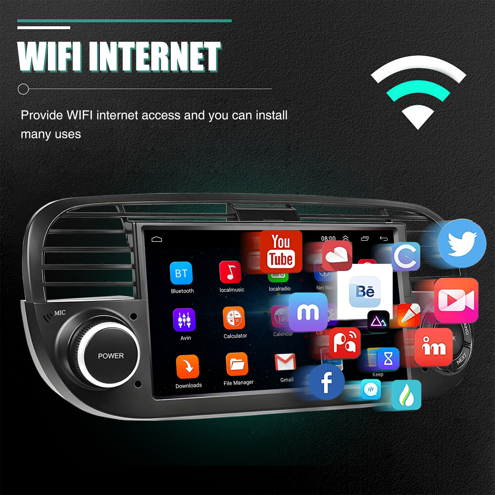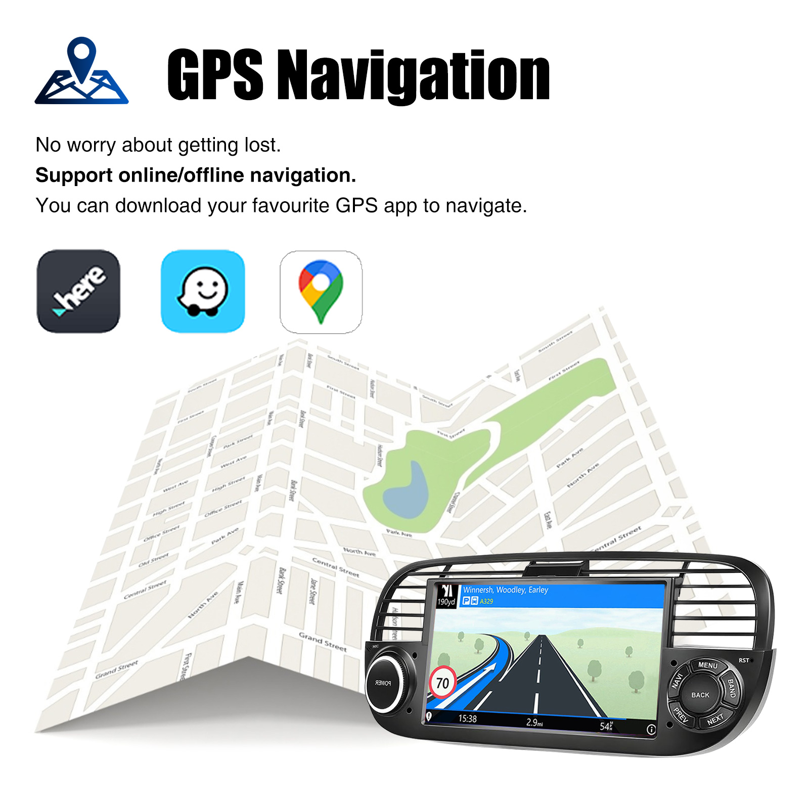 7 inch Android 14 car radio for FIAT 500 2007-2015:The Android car radio with 7" 1024*600 HD capacitive touch screen, 2GB RAM and 64GB ROM allows you to download your favorite apps and videos, so that driving is no longer boring. No additional frame, no cable change, plug and play. It comes with Canbus and supports most of the original functions: steering wheel control, reverse signals and reading original computer data, etc.Wireless Carplay & Android Auto: Immerse yourself in a seamless and user-friendly infotainment experience with Apple CarPlay & Android Auto. Connect your iPhone to Apple CarPlay or your Android smartphone to Android Auto and securely access calls, texts, navigation, music and more. With intuitive operation via the touchscreen or voice control, you have all functions at your fingertips while you remain safely at the wheel. Use your favorite apps and stay connected at all times while keeping your eyes on the road. Turn your vehicle into an extended hub for your mobile devices and experience a new dimension in infotainment.