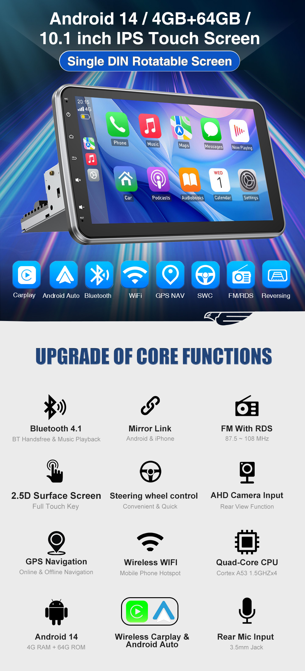 【10.1" Android Vertical Rotatable Car Stereo】This single din car stereo with high-definition 10.1 inch 2.5D tempered glass mirror touch screen,and which can be rotated by 180°.You can adjust the screen manually to make it display vertically or horizontally. Give you the most comfortable visual and touch experience.This car radio installation size is: 178(L)* 50(W)*145(D)mm.Please confirm whether the size is appropriate before buying.