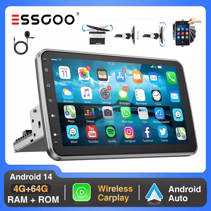 ESSGOO Single DIN 10" Carplay Car Stereo Radio Android 14 64G Rotatable Screen GPS NAV