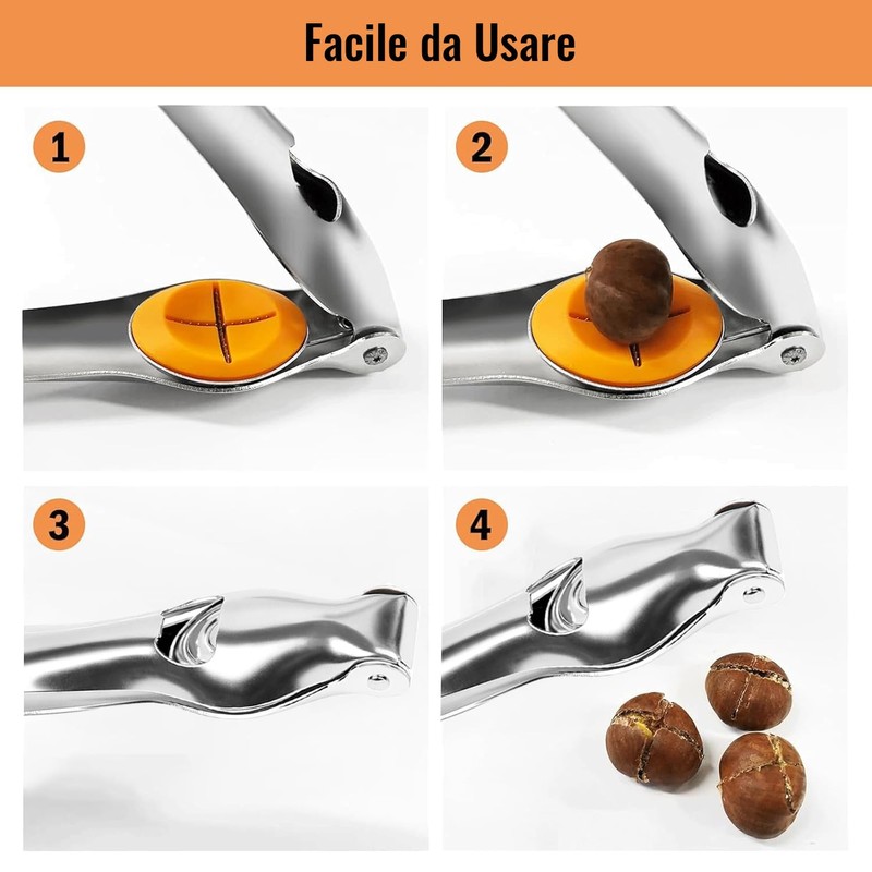 - Sharp toothing: the chestnut cutter even serrated edge allows easy cutting of the hard shell of chestnuts. The orange non-slip silicone pad prevents the pulp of the chestnuts from breaking