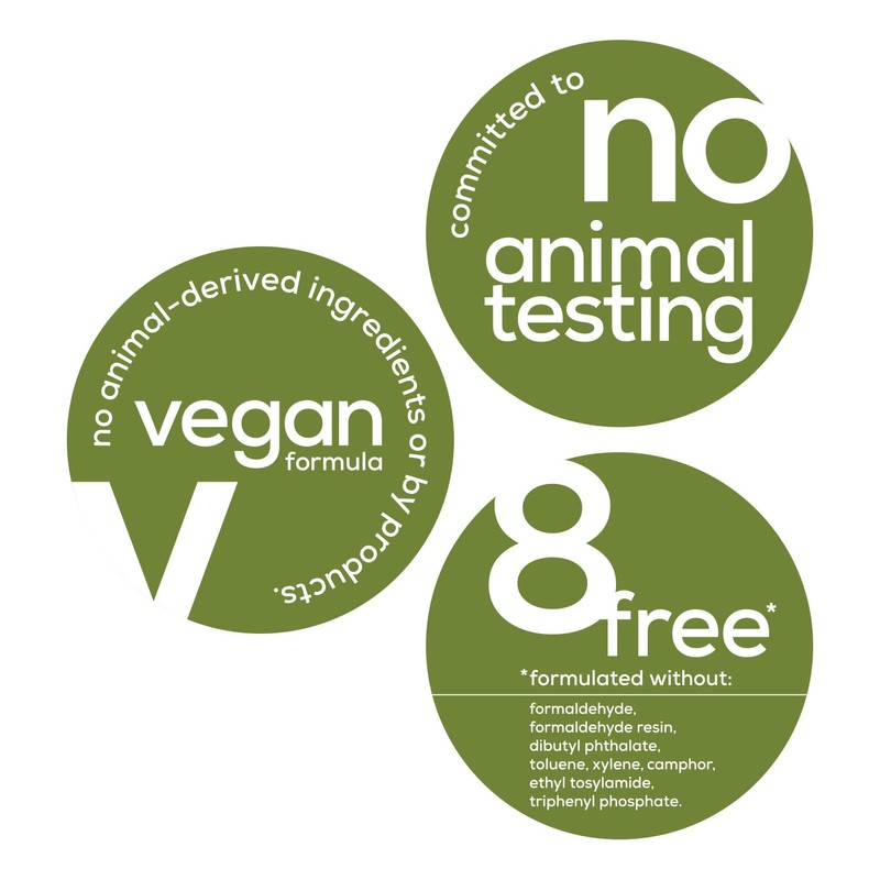 - 8-free, vegan formula- without formaldehyde, toluene, dibutyl phthalate, formaldehyde resin, camphor, ethyl tosylamide, xylene, triphenyl phosphate and animal derived ingredients.