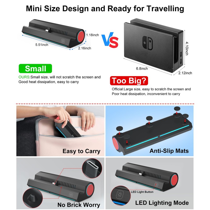 - Mini y portátil: el peso de la base de interruptor es de solo 90 g, que es mucho más pequeño que la base de interruptor original. Diseño compacto que hace que sea fácil de llevar, puedes disfrutar de tu juego de cambio con tu familia y amigos en cualquier lugar.