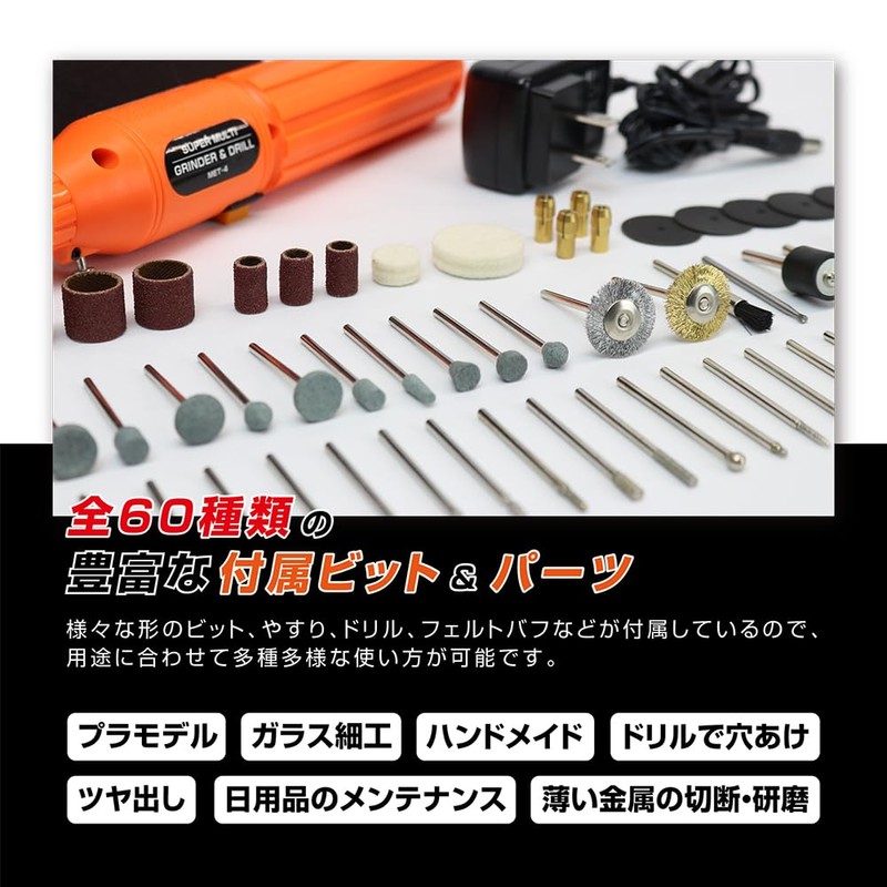 - 60 types of included bits and parts. Comes with various shapes of bits, files, drills, felt buff and so on, so you can use it in a variety of ways to suit your needs. Plastic Model Glass Handmade, Drilled Drilling, Glazing, Everyday Maintenance, Metal Cutting and Polishing