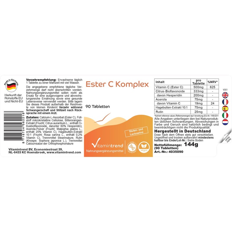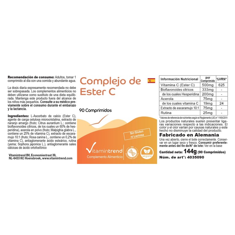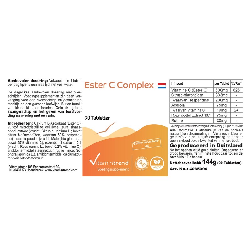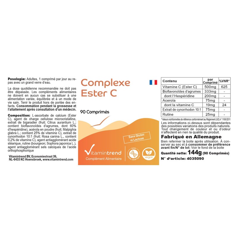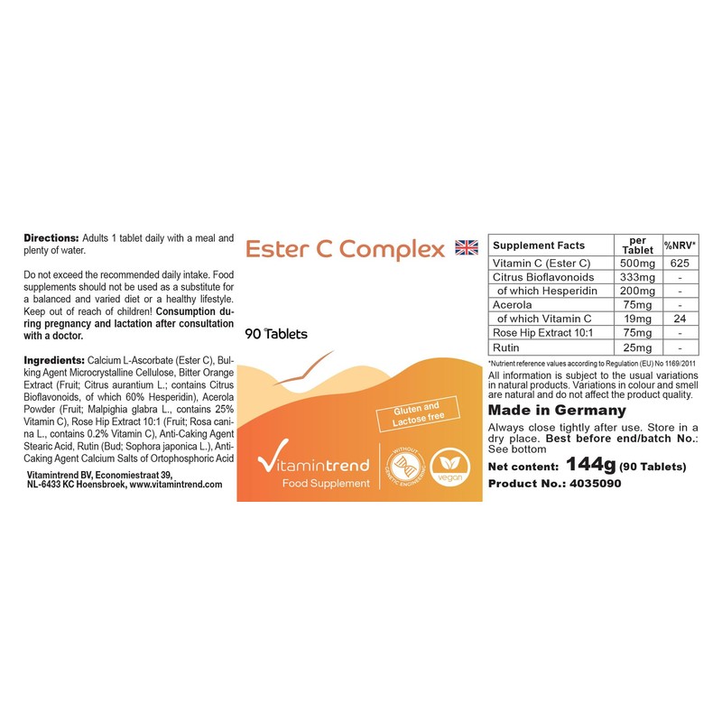 - Vitamin trend German quality. One tablet contains: 500 mg vitamin C (ester C) per tablet, 333 mg citrus bioflavonides of which 200 mg hesperidin, 75 mg acerola of which 19 mg vitamin C, 75 mg rose hip extract and 25 mg rutin. Adults 1 tablet daily with a meal with plenty of water. - Excellent value for money