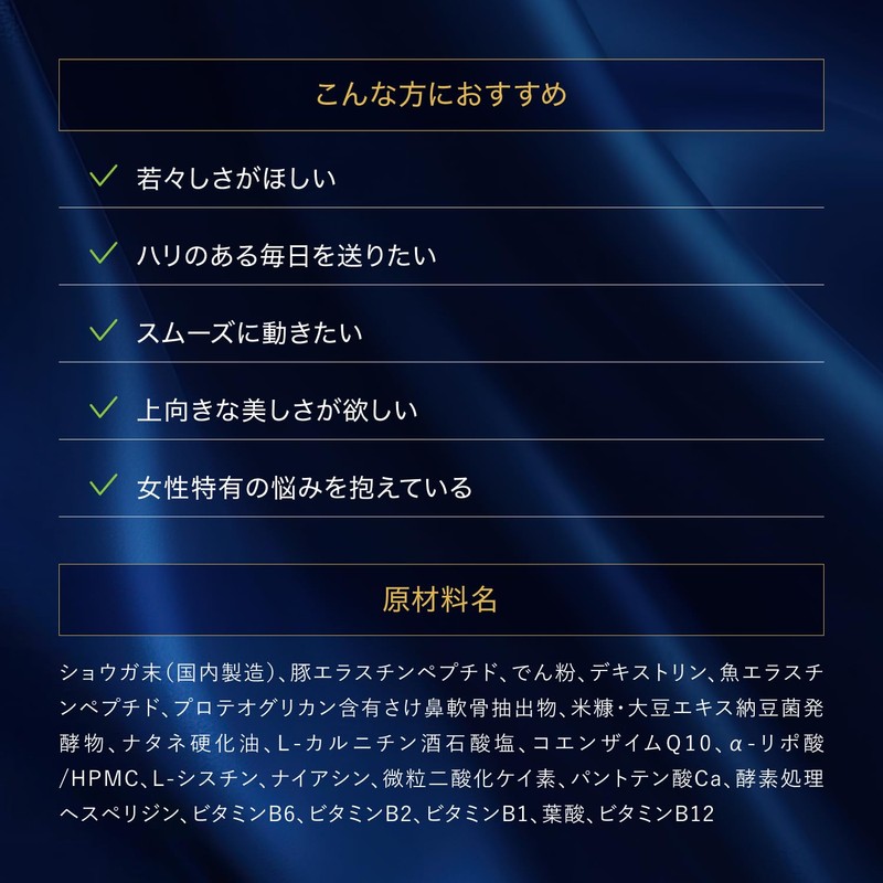 - (2 types of high quality elastin with 145 mg) formula: Combined with patented low-molecular domestic pigg elastin and Katsuoelastin derived from the arterial phases of Katsuo to achieve high absorbency and effectiveness