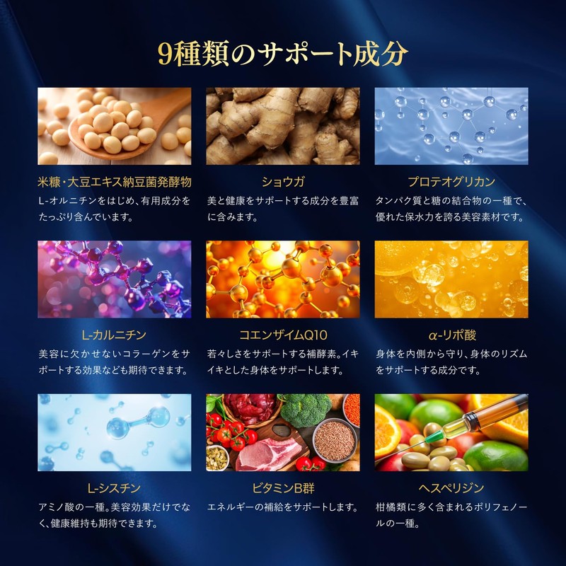 - Formulated with 9 Types of Support Ingredients: Includes ginger, rice bran, soy extract, natto fermentation, proteoglycan, L-carnitine, coenzyme Q10, α-lipoic acid, L-cystine, B vitamins and hesperidin, providing a multitude of beauty and health