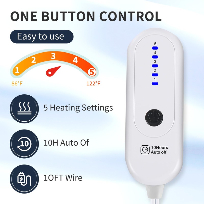 - 【5 Heating Levels and 10 Hours Auto Off】Enjoy personalized warmth control with 5 adjustable heat settings, this twin size electric blanket ranging from gentle warmth to high(adjustable from 86°F to 122°F). The intelligent 10-hour auto shut-off function ensures energy efficiency and safety.