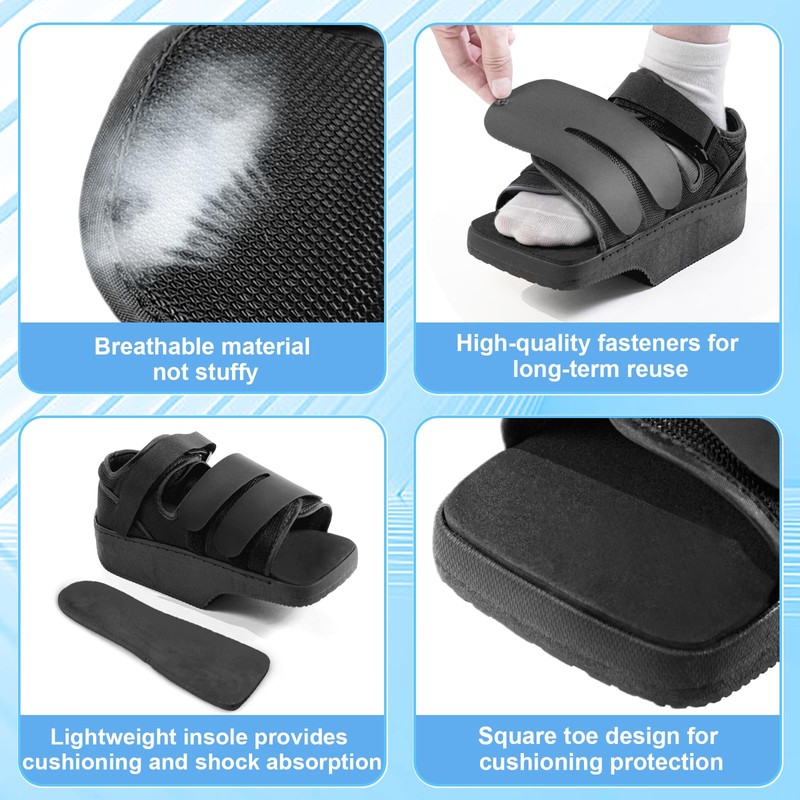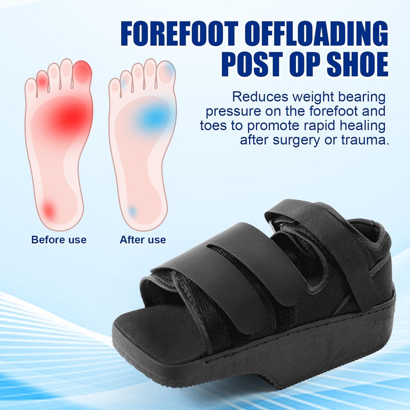 • 1. Forefoot Offloading Design: This forefoot offloading post-op Shoe uses a scientifically designed wedge sole to shift weight to the heel, significantly reducing pressure on the forefoot and toes. Ideal for post-surgery recovery, diabetic foot ulcers, or forefoot injuries, this wedge post op shoe promotes faster healing by minimizing strain on sensitive areas.