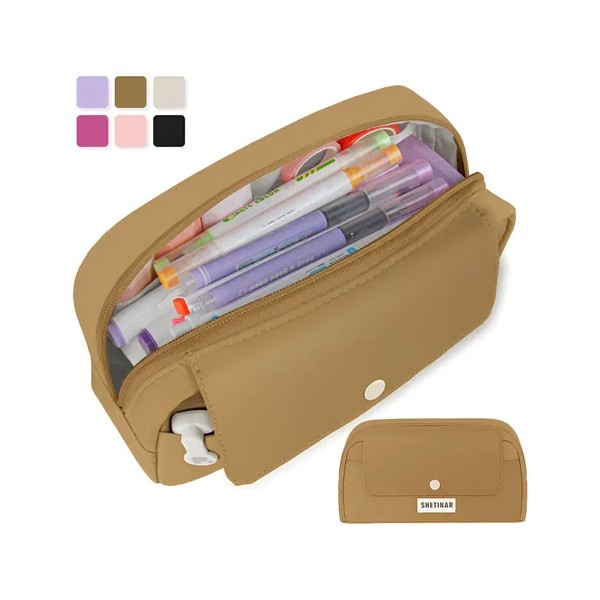 Diseño único con 2 compartimentos: el compartimento principal superior puede contener artículos de papelería diarios, mientras que la capa inferior se puede abrir completamente y colocar plana en el escritorio, lo que permite suministros escolares más grandes como calculadoras, barras de pegamento, tijeras, notas adhesivas, etc.