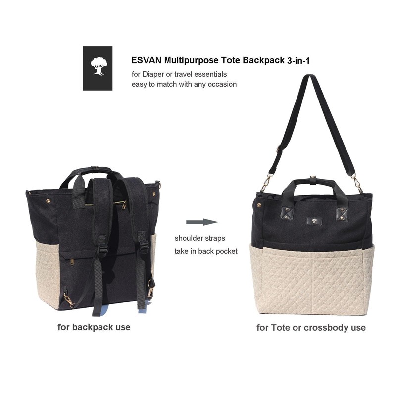 ESVAN Diaper Tote Bag Totepack Backpack Crossbody Bag 3 in 1 for Women Laptop Backpack Multifunctional with Insulated Pockets (Linen Beige)