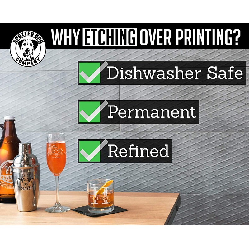 - Laser etched This glass features expert laser etching on the side that is elegant, permanent, and dishwasher safe