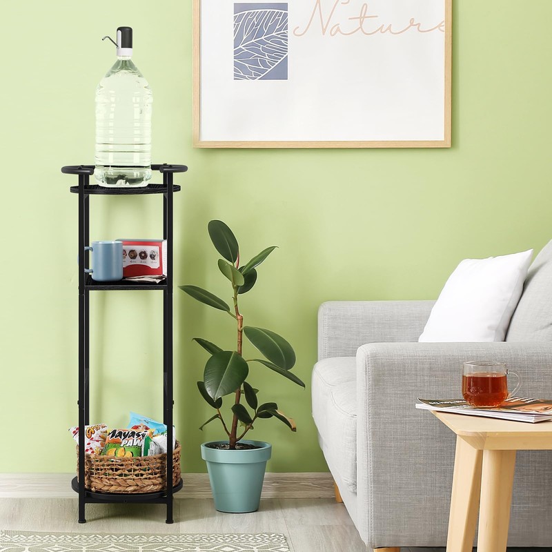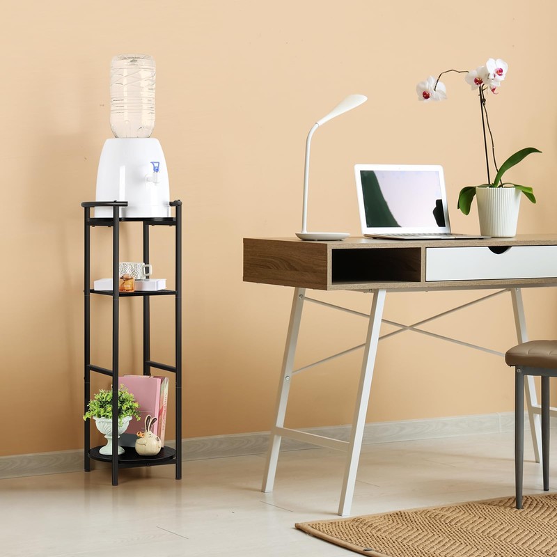 - 【Compact Size】Product Dimensions: 12.9"D x 13.3"W x 36.5"H. The top round shelf's diameter is 11.8". Water stand can hold 1-5 gallon water bottles, ceramic water dispenser on the top shelf. 2-tier shelves underneath can hold other plants, cups or decorations. Fit into any corner, whether it's in the kitchen, living room, or even a small office. Maximizes space utilization efficiently and not taking up too much room.