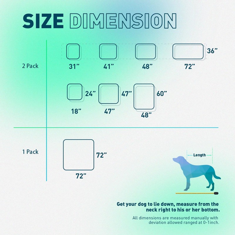 - Product Details - Puppy training pads measure 36'' x 48'' and include 2 pack. Please note: Do not touch the pad with sharp things and trim your dog's nails regularly or it could cause leak. Suitable for dogs of any age or size.