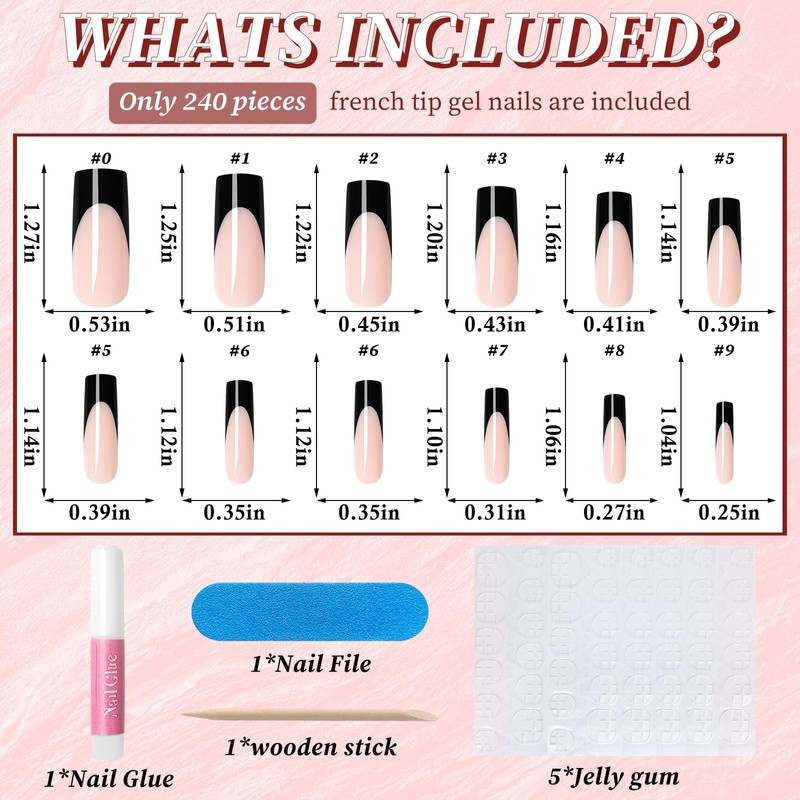 - Gel French Tip Nails: EternalClassic press on nails french design pink fake nail kit comes with 240 pieces of long length pink square fake nails, 5 sheets of nail adhesive tabs, 2 pieces of nail glue, 1 mini nail file, and 1 wooden stick. These press on nails are the easiest way to achieve a salon look without spending money or time on a visit