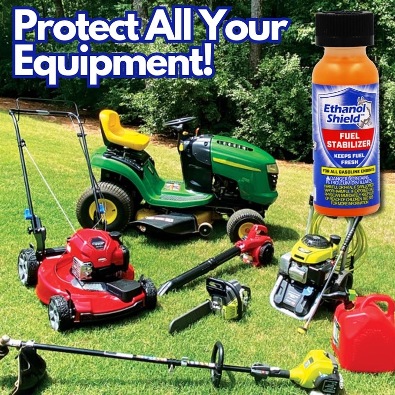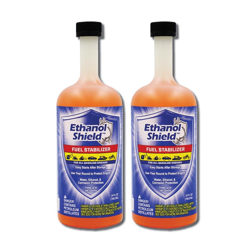 Prevent future engine problems with Ethanol Shield. This year-round triple antioxidant formula fuel stabilizer is used for your power equipment with 2-cycle and 4-cycle engines. This preventative maintenance formula eliminates then prevents ethanol-related problems. It removes water, provides easy engine starting all year, and keeps stored fuel fresh. Use 1 oz. per 10 gallons of fuel. 24 oz bottle - sold in a 2-pack.