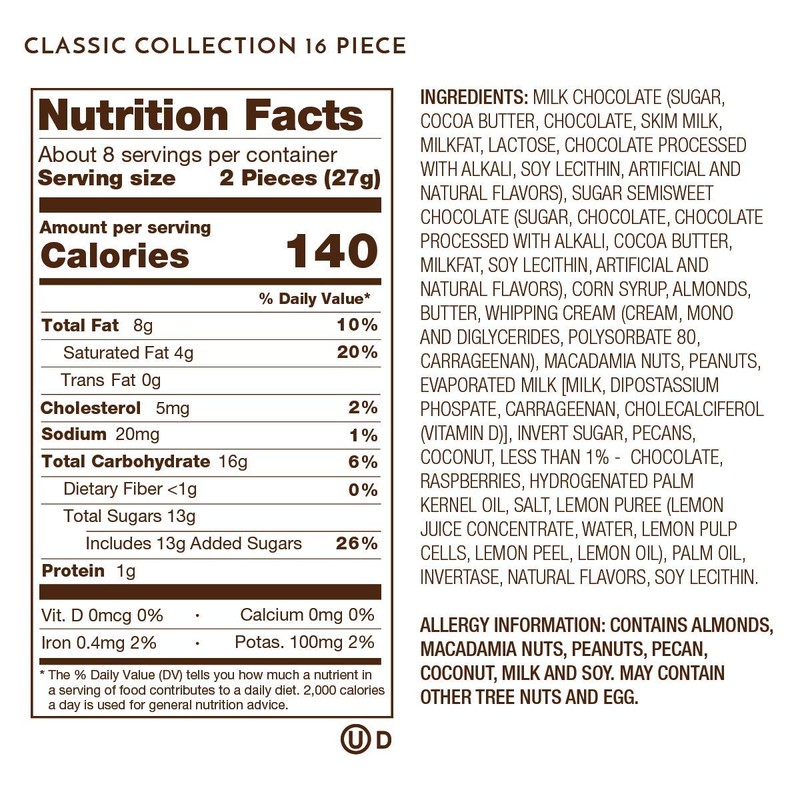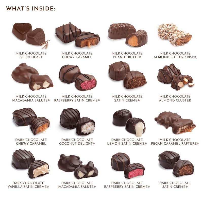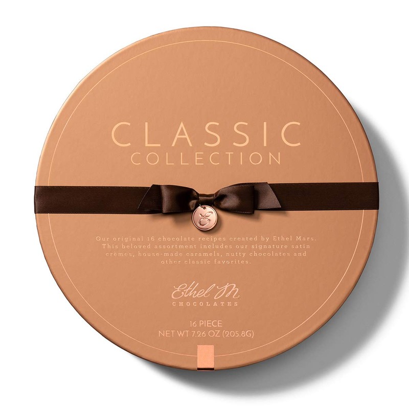 - CLASSIC COLLECTION 16-PIECE CANDY GIFT BOX features popular Ethel M Chocolates premium candy flavors. Signature chocolate assortment candy gift box contain customer favorites; Pecan Caramel Rapture, Lemon Satin Crmes, Almond Butter Krisp