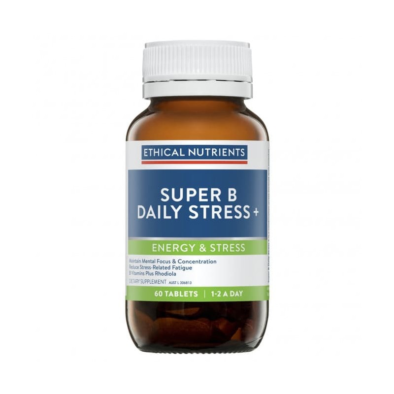 Ethical Nutrients Super B Daily Stress + contains B vitamins plus Rhodiola to improve mental performance and reduce stress related fatigue in stressed people.