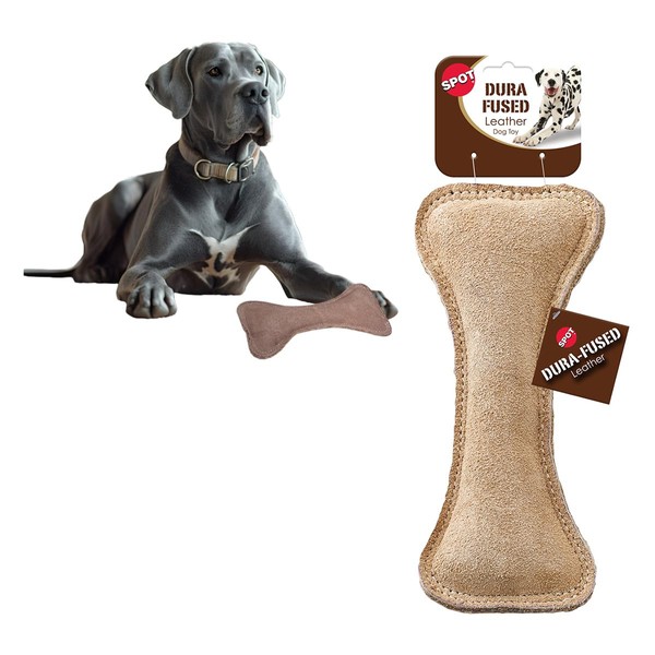 SPOT Dura-Fused Leather Bone- Durable Dog Toy with Squeaker, Real Leather & Jute Fabric, Interactive Toy for Moderate & Aggressive Chewers, Medium & Large Dogs and Puppies, 9 inch