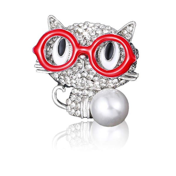 ETHOON Cute Cat Brooch Pin Red Glasses Fortune Cat with Imitation Pearl Lapel Pin Silver
